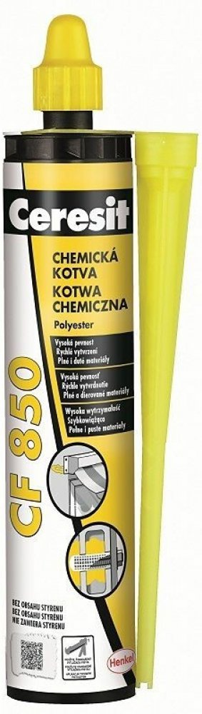 CF 850 je dvousložková reaktivní pryskyřičná malta s rychlým tuhnutím, vysokou pevností v tlaku i ohybu a odolností vůči chemikáliím. Nepůsobí expanzně, a proto je vhodná pro bezpečné kotvení bez poškození podkladu. Využitelná je jak v interiéru, tak exteriéru, při vodorovném i svislém kotvení. Hodí se pro upevnění tyčí, závitových kotev, bran, zábradlí, stožárů, madel, ventilátorů, klimatizací, konzol, mříží, obkladů, skříněk, rozvodů, sanitárního vybavení i potrubí.