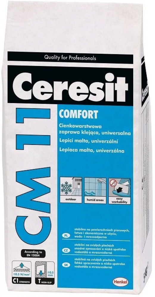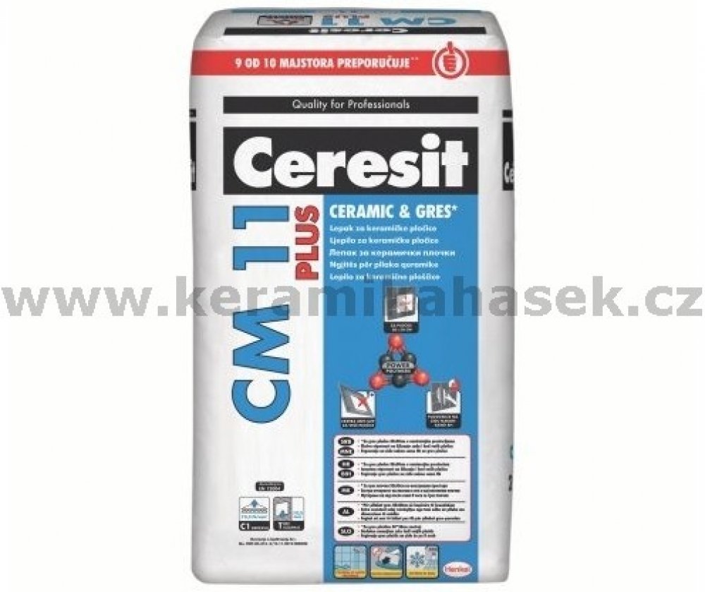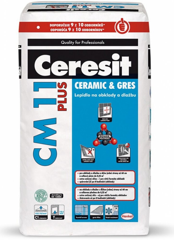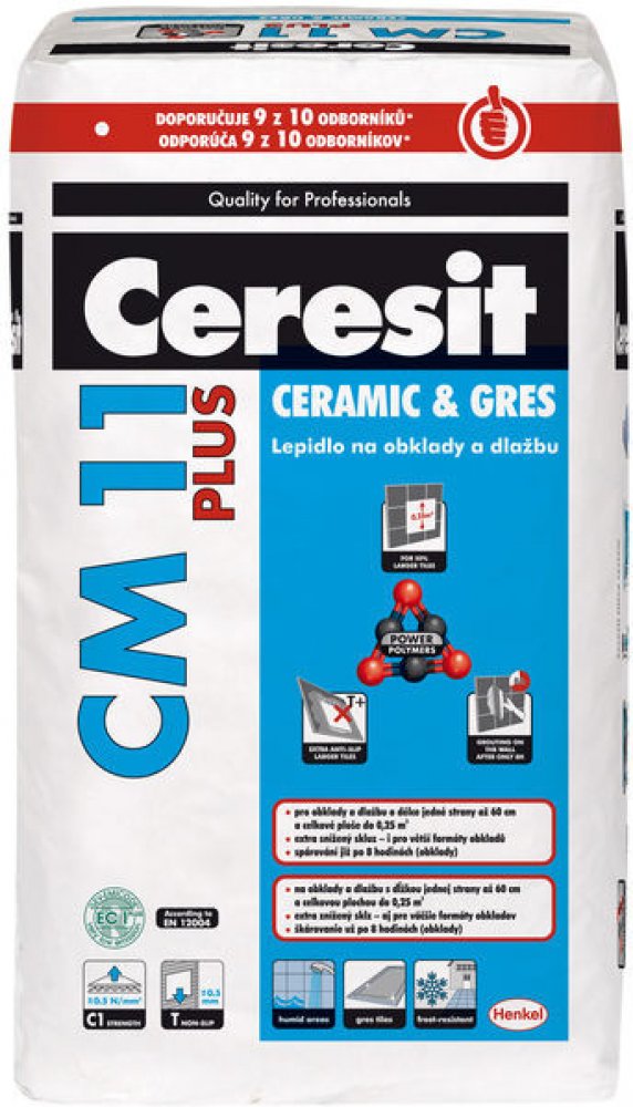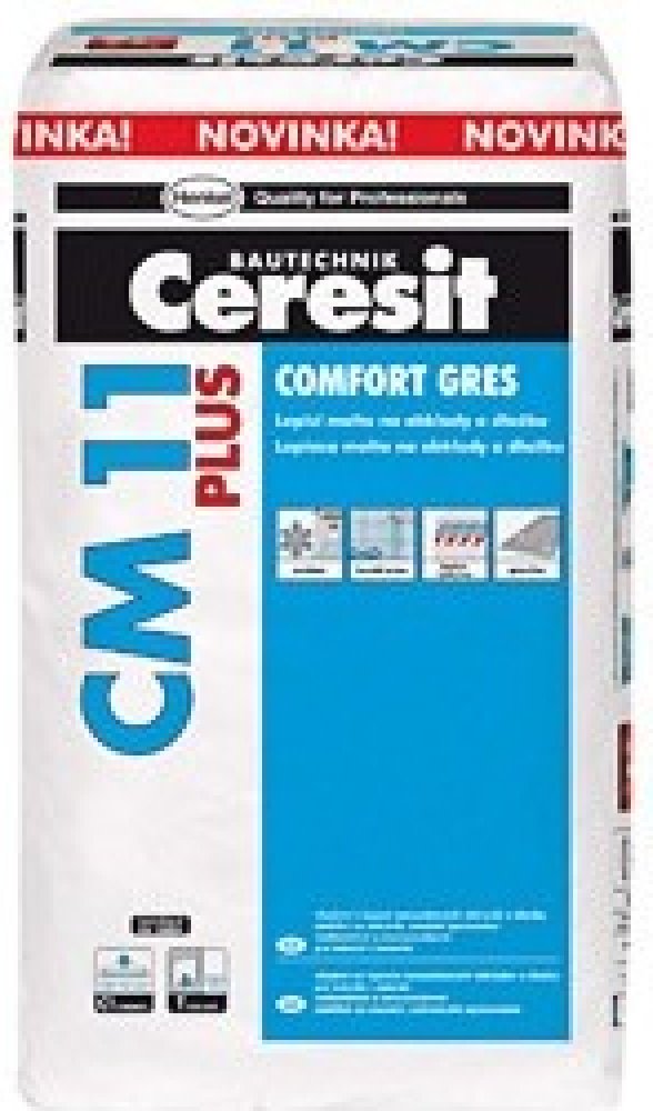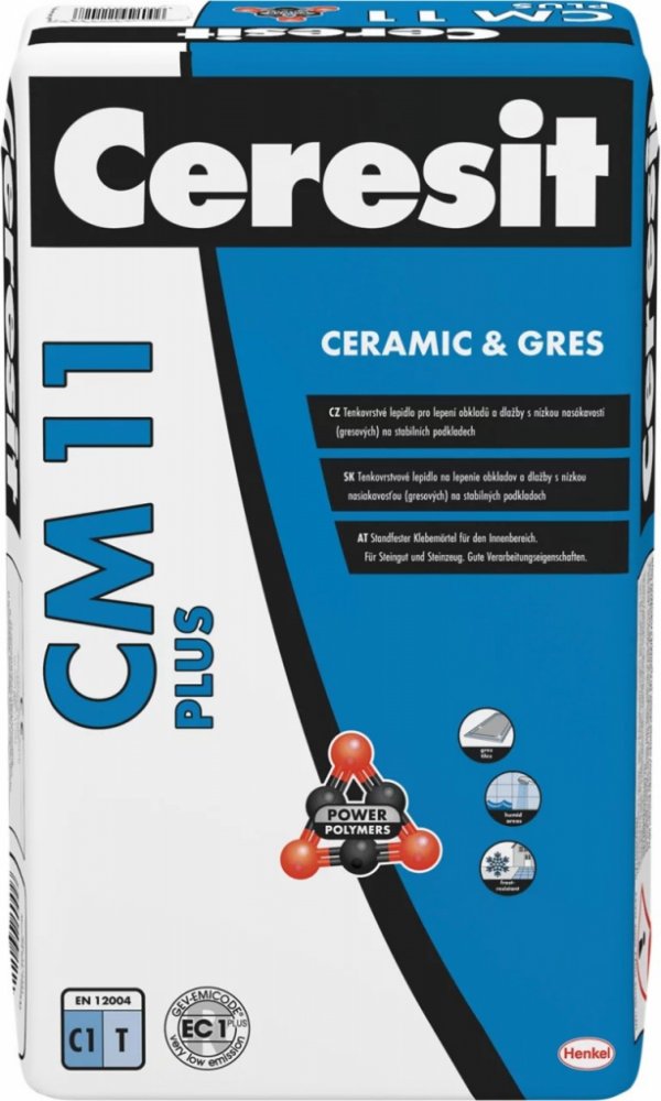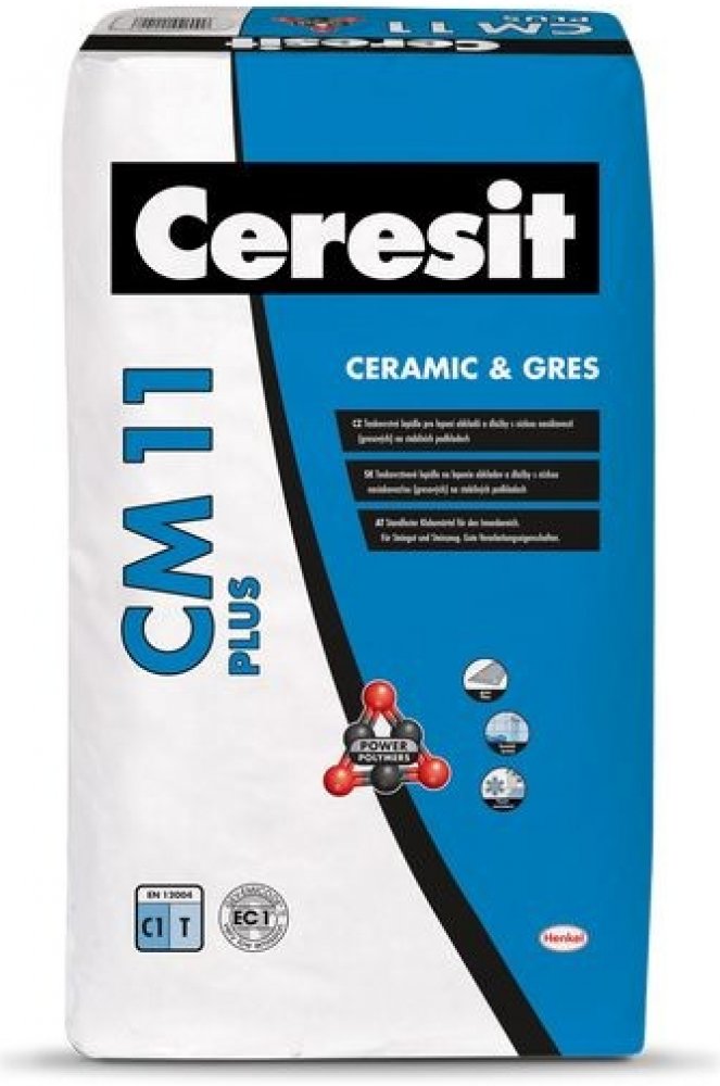 Ceresit CM 11 PLUS je lepidlo, určené k lepení keramických i gresových obkladů, obkladů z přírodního kamene (nenáchylného na probarvení) na podkladech stabilních a stálých jako např: beton, cementové potěry, cementové i vápenocementové omítky, anhydrid, sádrové podklady, pórobeton, případně ve vlhkých prostorech opatřené utěsněním pod obklady Ceresit CL 51 nebo těsnicí maltou Ceresit CR 65, (není ...
