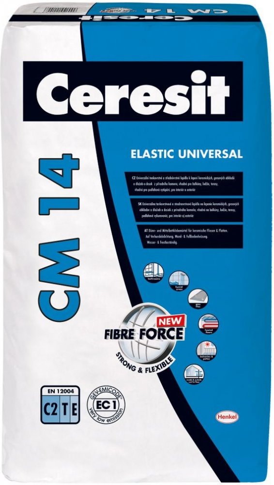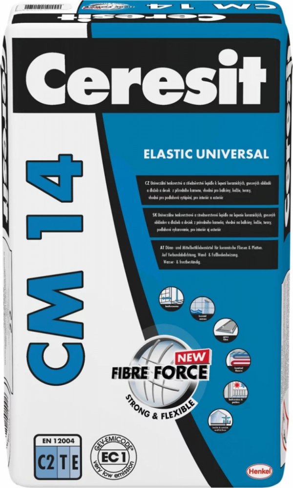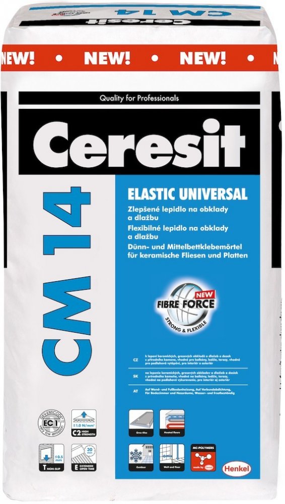 Zlepšené lepidlo Ceresit CM 14 UNIVERSAL je určené k lepení nenasákavé (gresové) a keramické dlažby, cementových desek a obkladů z umělého i přírodního kamene nenáchylného k probarvení v interiéru i exteriéru a k lepení na kritických podkladech