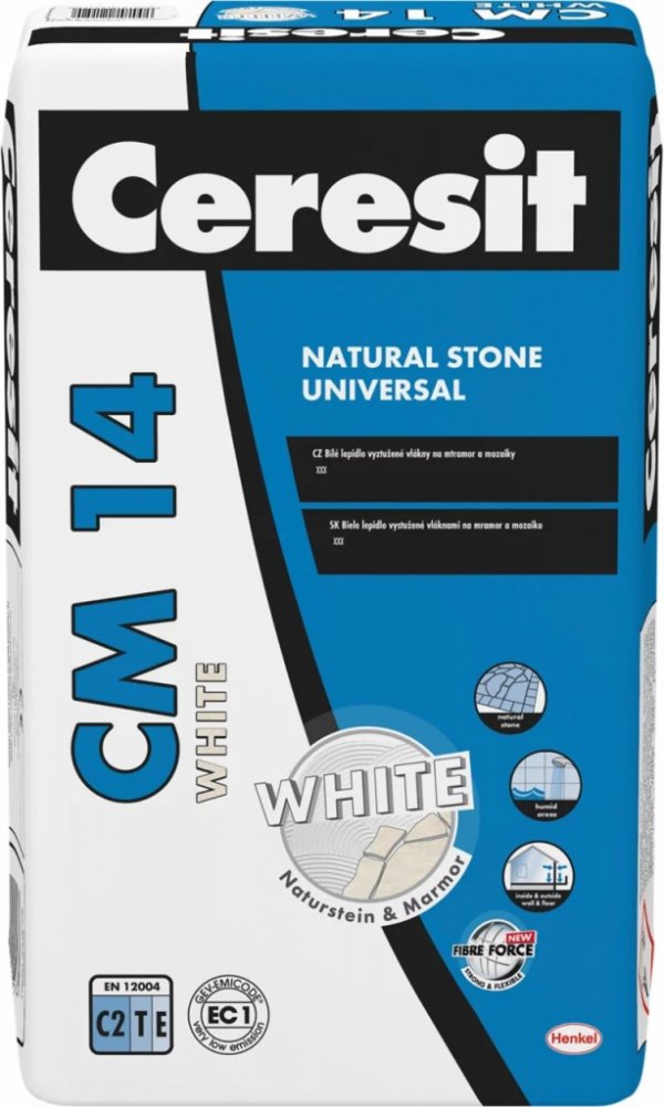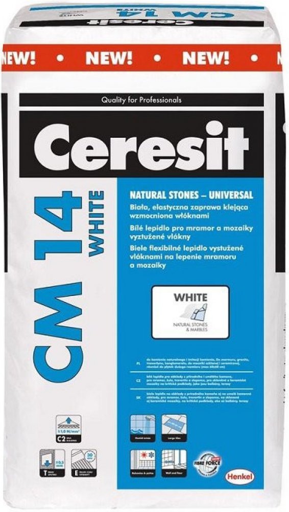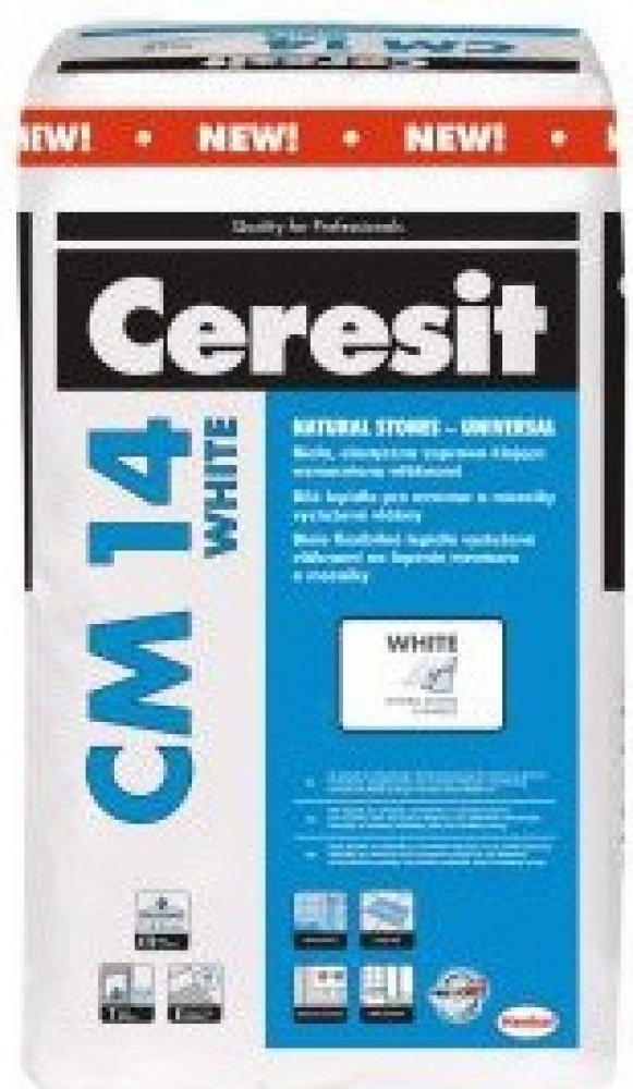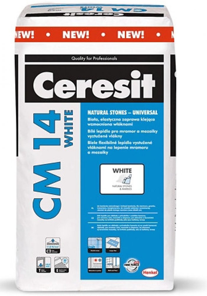 Ceresit CM 14 WHITE je bílé lepidlo určené k lepení mramoru, žuly, pískovce, travertinu, slepence, světle zbarveného vápence a jiných hrubozrnných, barevně stálých kamenných obkladů. Je také vhodné pro lepení keramických a gresových obkladů, glazovaných keramických obkladů a terakoty, stejně tak i všech typů mozaiky, včetně skla a keramiky. Testy vzorků jsou doporučovány před nalepením obkladů či dlažby, aby se zjistilo, zda lepidlo nezpůsobuje žádné změny barvy. Vlastnosti lepidla umožňují pokládku obkladů a dlažby na sádrokartonové desky a na podklady, jako jsou anhydritové potěry, sádra, pórobeton a těsnicí vrstvy. Materiál lze aplikovat na terasy, balkony, schodiště, vytápěné podlahy, fasády, OSB a na stávající keramické obklady a dlažby (pouze v interiéru). Je také vhodné k použití v místech se silným provozem a vysokým provozním zatížením, jako jsou: komunikační prostory, chodby, školy, supermarkety, obchody, restaurace atd. CM 14 WHITE má vysokou přilnavost a je dobře roztíratelné, což umožňuje při správné aplikaci kvalitní spojení mezi obklady nebo dlažbou a podkladem, a to i v provozech s velkým zatížením. Vzhledem na tvarovou stabilitu lepidla po dobu tuhnutí a zrání nalepené prvky po lepení pevně přilnou ke zvolené pozici. U ostatních typů obkladů a jiných podkladů nebo v případě vyššího zatížení doporučujeme použít jiné vhodné lepidlo Ceresit.