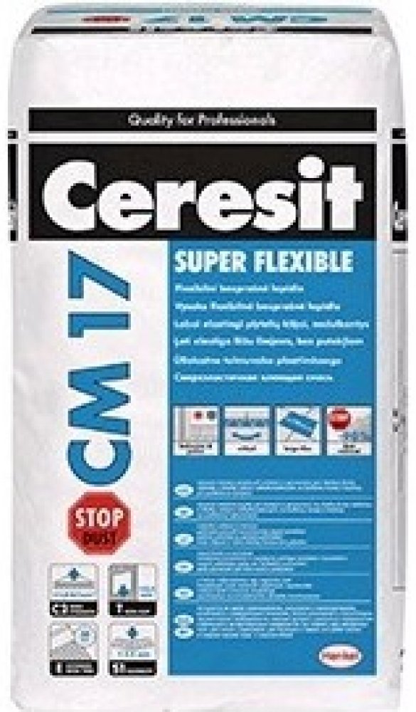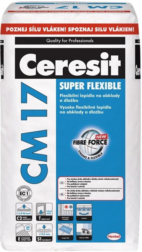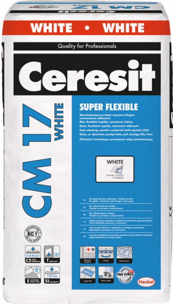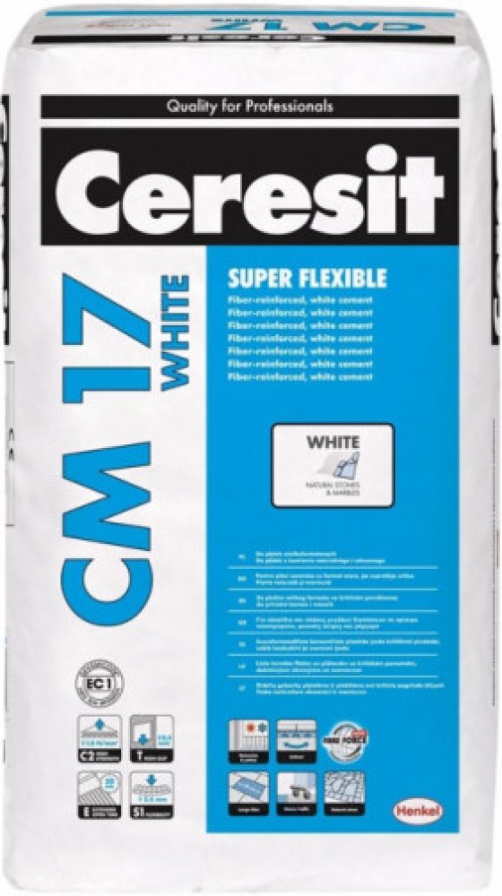 Lepidlo na obklady, dlažby, desek betonu a mramorCeresit CM 17 White je lepidlo určené k lepení obkladů a dlažby z keramiky, desek z betonu a přírodního kamene jako mramor, granit, travertin, desky ze světlého vápen-ce a jiných druhů hrubozrnného kamene nenáchylného na probarvení na stabilních i kritických podkladech