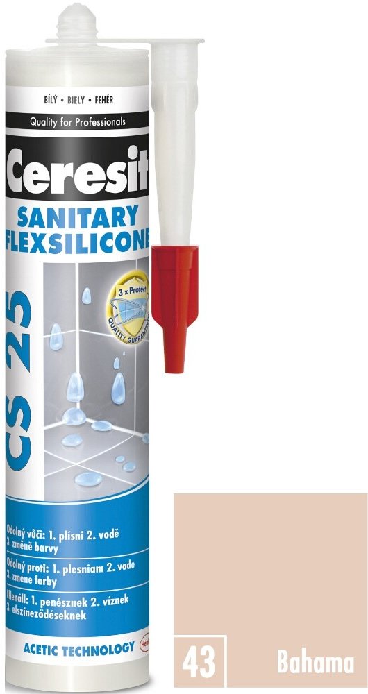 Sanitární silikon Ceresit CS 25 je určen pro vyplnění dilatačních a spojovacích spár mezi keramickými obklady a dlažbami v rozích nebo ve styku stěn, podlah a k usazování zařizovacích předmětů v sanitární oblasti. Je určen k vyplňování spár tam, kde běžné spárovací hmoty vykazují trhliny a praskliny. Díky trvalé elasticitě a odolnosti proti vodě je vhodný do oblastí trvale zatížených vlhkostí, jako např.: kuchyně, sprchy, koupelny, toalety, balkóny, terasy apod. Nová receptura sanitárního silikonu Ceresit CS 25 MicroProtect, v porovnání s dosud vyráběnou, obsahuje trojnásobné množství protiplísňových přísad a zaručuje v místech, kde se na povrchu spár nemůže držet voda, dlouhodobou ochranu proti vzniku plísní a jejich působení. Spáry tak zůstávají čisté a zdraví neškodné. Materiál má vynikající přídržnost k suchým i nesavým podkladům jako: sklo, keramika, porcelán, pórovina, email apod. K vyplnění spár a prasklin ve zdivu, omítkách, mramorech, betonu a cementových potěrech použijte jiné tmely z řady Ceresit. Sanitární silikon Ceresit CS 25 není vhodný pro použití v nádržích na pitnou vodu a pro lepení akvárií.balení: 280 ml, plastová kartuše