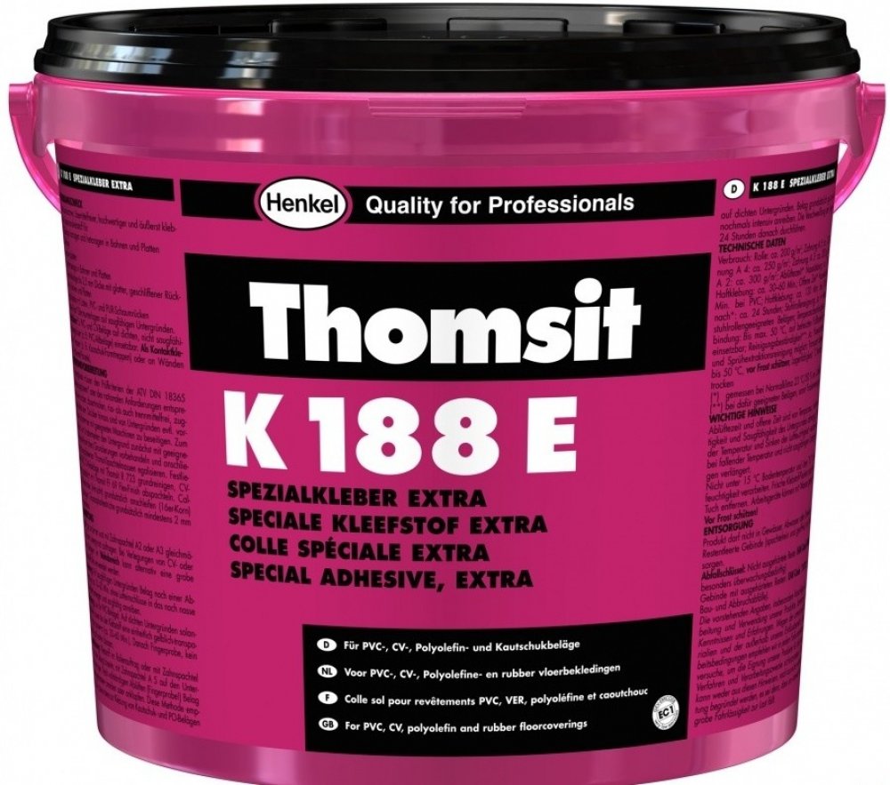 Poznámka:Bezrozpouštědlové, vysoce kvalitní, velmi pevně lepicí disperzní lepidlo pro lepení homogenních a heterogenních PVC krytin v pásech a dílcích, jakož i polyolefinových krytin. Vhodné také pro lepení tvrdých vinylových dílců a kaučukových krytin do 2,5 mm tloušťky (např. Noraplan) s hladkou broušenou zadní stranou v pásech a deskách. Lepí textilní krytiny s latexovanou, PUR pěnovou a PVC rubovou stranou na podlahy, stěny a strop. Kromě toho je vhodné pro lepení PVC a CV krytin na nesavých podkladech (adhezní lepení) jako např. PVC na PVC. Také k lepení izolačních podložek Thomsit-Floor. Technické informace: Barva: krémově bílá. Dodávaná forma: pastovitá. Specifická hmotnost: 1,1 kg/l. Spotřeba: - váleček, - ozubení A1, - ozubení A2, - ozubení A3, - ozubení A4, 150 – 200 g/m², cca 250 g/m², cca 280 g/m², cca 300 g/m², cca 220 g/m², Doba odvětrání: - lepení za mokra, - adhezní lepení, savé podklady 10 – 20 min., nesavé podklady 30 – 60 min. . Otevřená doba: - savé podklady, - nesavé podklady, cca 40 min., cca 120 min., Zatížení po: cca 24 hod., Konečná pevnost po nalepení po: max. 72 hod., Vhodnost pod kolečkové židle: ano. Tepelná odolnost pro transport a skladování: 0 °C až 50 °C. Tepelná odolnost spoje po vytvrzení: až do +50 °C, vhodné na podlahové vytápění.