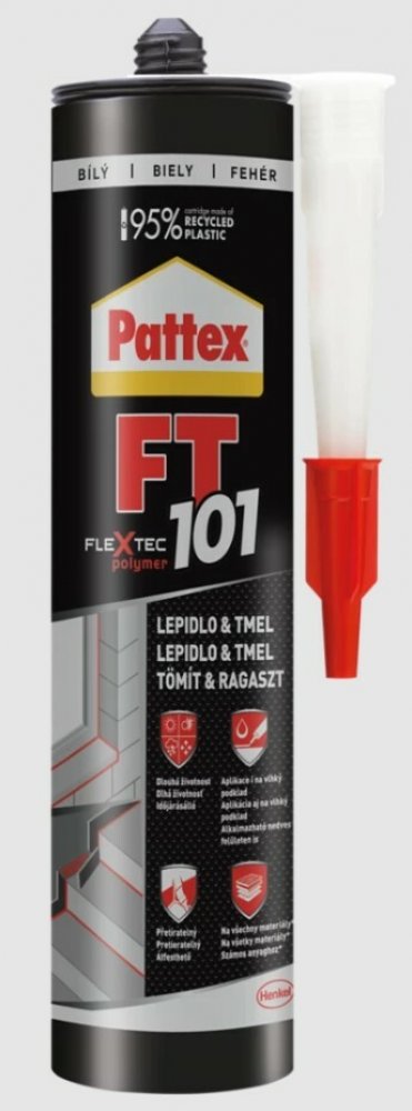 PATTEX FT 101 je víceúčelový, elastický lepicí tmel určený pro použití v interiéru i exteriéru, založený na technologii Flextec. FT 101 je vhodný pro lepení a tmelení všech druhů spár, včetně dilatačních, vyplňování dutin a spojů ve všech materiálech a za každého počasí. Vynikající přilnavost na suché i mokré povrchy (dokonce i pod vodou).
