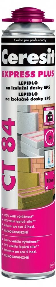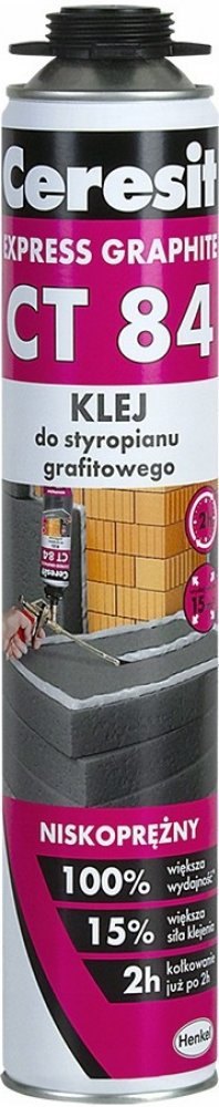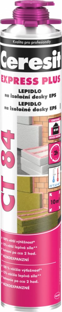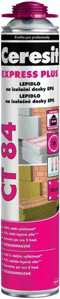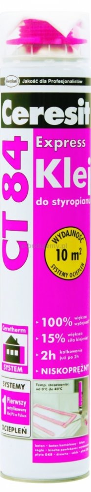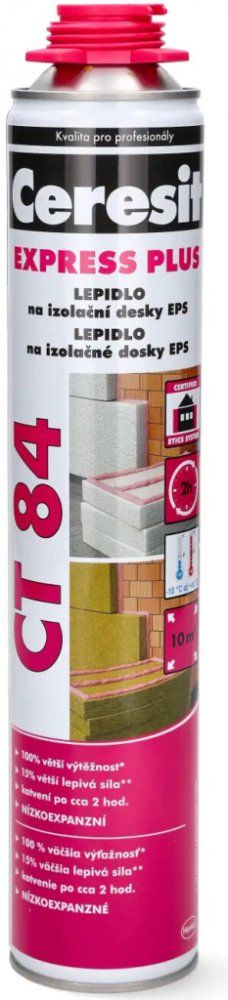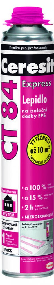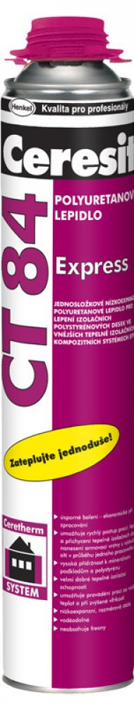 Polyuretanové lepidlo Ceresit CT 84 Express je určeno k lepení polystyrénových desek v exteriéru v kontaktních systémech zateplení budov Ceresit Ceretherm. CT 84 Express je určeno k použití při provádění zateplovacích prací u novostaveb nebo při rekonstrukcích stávajících objektů.