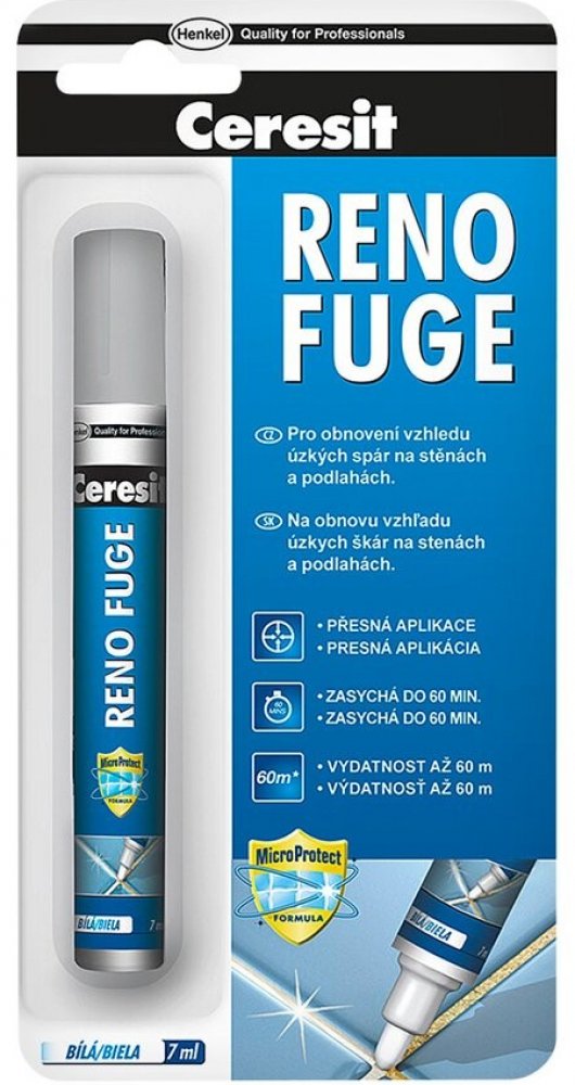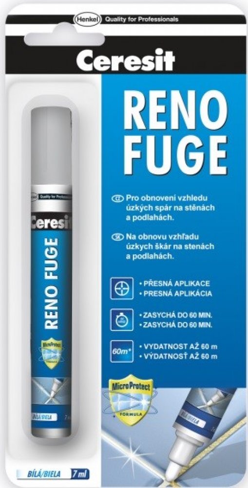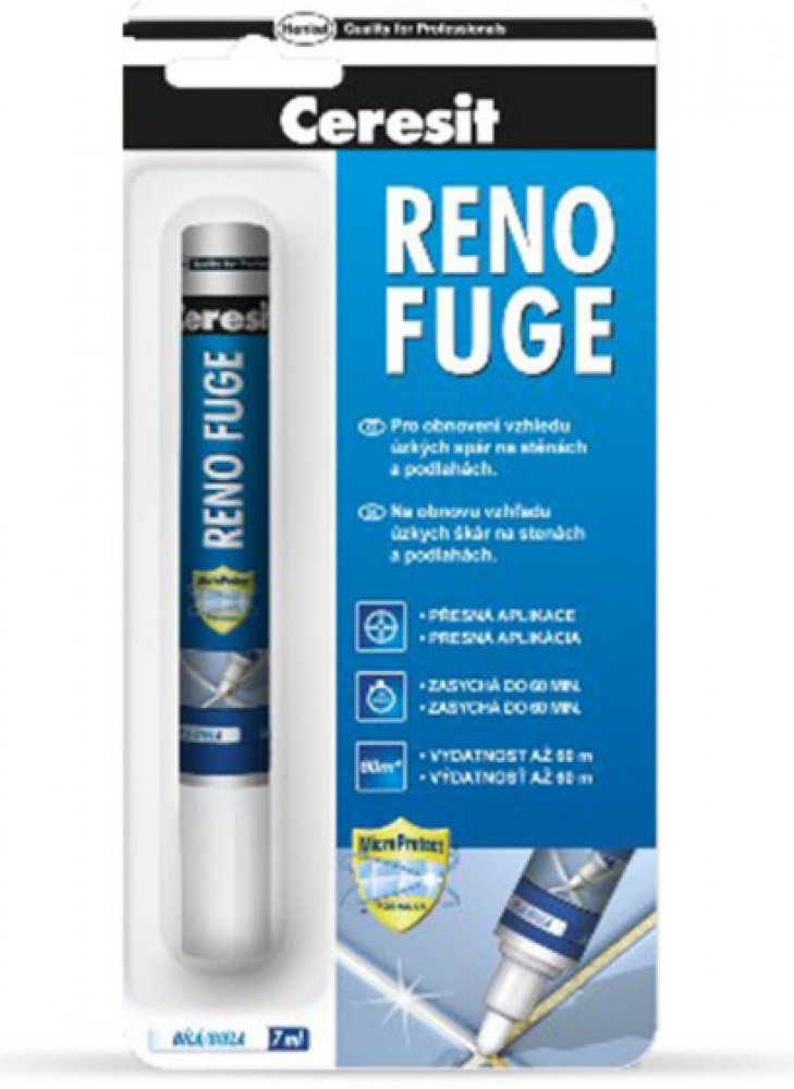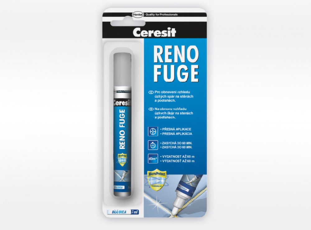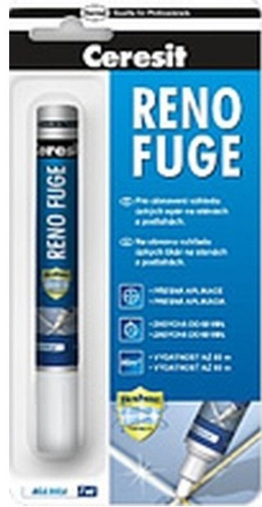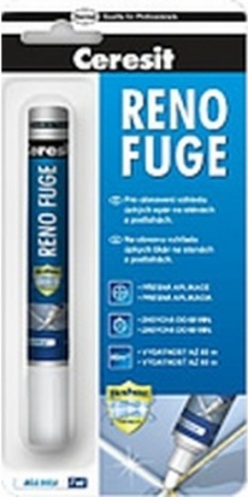 Ceresit RENO FUGE je ideálním řešením pro rychlé "omlazení" obkladů bez nutnosti náročného mechanického odstraňování staré spárovací hmoty. Jedná se o speciální nátěrovou hmotu v praktickém balení připomínajícím silný fix, která staré, zašedlé nebo zažloutlé spáry překryje novou vrstvou zářivě bílé barvy.