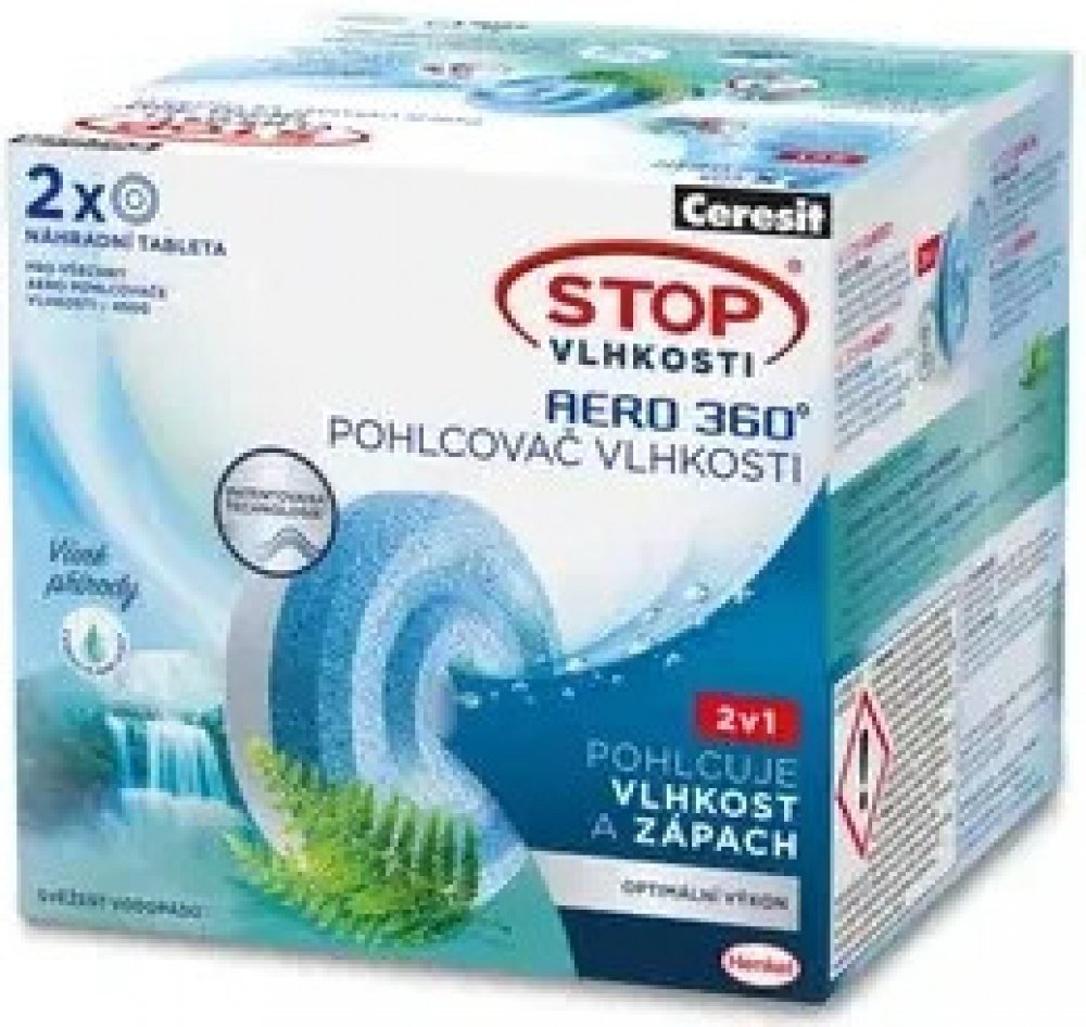 2 náhradní 450 g tablety s vůní svěžest vodopádů do pohlcovačů vlhkosti Ceresit Aero 360°, který pomáhá snižovat vzdušnou vlhkost a zápach v místnosti o rozloze cca 20 m² po dobu přibližně 3 měsíců. Bojuje proti plísním a odlupování tapet, snižuje vývoj roztočů a plísní, čímž přispívá ke zdravějšímu prostředí doma nebo v práci. Zároveň po celou dobu životnosti uvolňuje svěží vůni, která vytvoří výjimečnou atmosféru u vás doma. Přebytečná vlhkost v místnosti je absorpční tabletou zachycena a následně přeměněna na solný roztok, který se hromadí ve spodní části přístroje. V závislosti na rychlosti pohlcování tableta ztrácí svůj objem, dokud se zcela nerozpustí. Systém funguje na fyzikálním principu – čím větší je kontakt tablety se vzduchem, tím více vlhkosti pohlcuje. Ultraabsorpční tableta má speciální vlnitý tvar a otvor ve středu, což umožňuje celoplošný kontakt vzduchu s tabletou a zvyšuje výkon celého systému. Účinnost je tak vyšší až o 40 % v porovnání se standardním systémem Henkel.