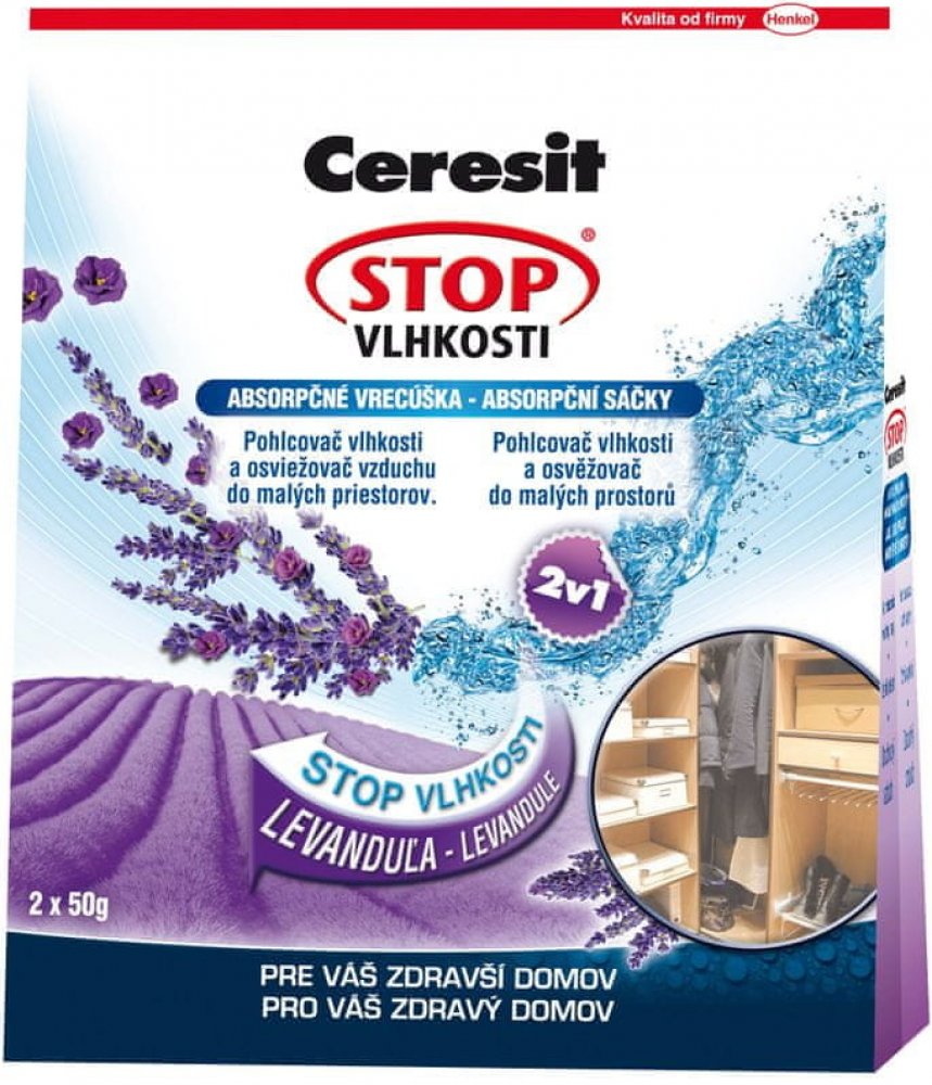 Ceresit Stop vlhkosti absorpční sáčky 2× 50 g (2695721) Absorpční sáček Ceresit intenzivně pohlcuje nadměrnou vlhkost, která je pomocí granulátu proměňována na gel. Speciální tkanina na povrchu sáčku propouští vlhkost jen dovnitř a zabraňuje unikání zpět ze sáčku. Polopropustná membrána zajišťuje cirkulaci vzduchu, ale zároveň zabraňuje úniku nahromaděné vlhkosti zpět ze sáčku. Sáčky jsou vhodné p...