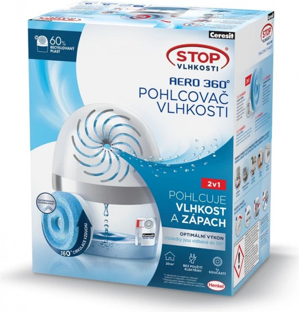 Tento pohlcovač vlhkosti vytváří spolu s náhradní tabletou AERO 360° jedinečný systém, který pohlcuje vlhkost v místnosti o rozloze 20 m2 po dobu přibližně 3 měsíců. Přebytečná vlhkost je zachycena tabletou a následně přeměněna na solný roztok, který je zachycován ve spodní části přístroje. V závislosti s tím, jak je vlhkost pohlcována, tableta ztrácí svůj objem, dokud se zcela nerozpustí. Do větš...