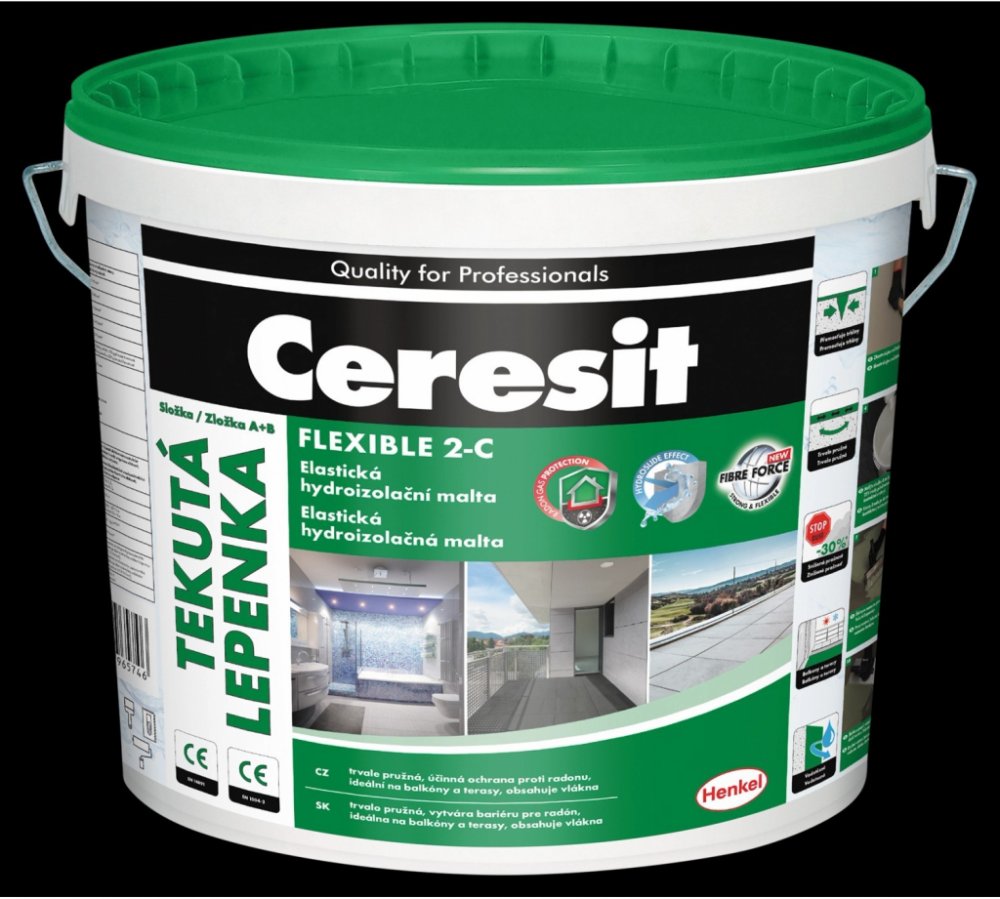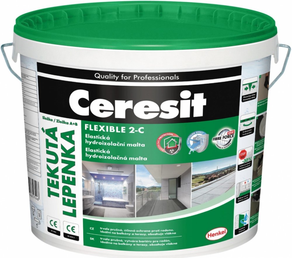 Dvojsložková hydroizolační malta k izolování staveb a stavebních dílců proti působení vody a radonu. Ceresit tekutá lepenka je dvousložková, trvale pružná hydroizolační stěrka vyztužená speciální kombinací vláken. Je vhodná pro hydroizolování sklepů, základů a betonových prvků. Díky UV odolnosti je ideální pro vytvoření účinné hydroizolace na balkóny, terasy s nášlapnou vrstvou položenou na roštu (např. dřevěné, palubové desky), nebo s keramickými deskami uloženými na distančních terčích. Při správné aplikaci vytvoří Ceresit tekutá lepenka účinnou ochranu proti průniku radonu. Po vytvrzení je možné na Ceresit tekutou lepenku přímo nanášet cementová lepidla nebo potěry. Ceresit tekutá lepenka není vhodná jako konečná vrstva, neodolává mechanickému zatížení. Na sádrové podklady doporučujeme použít jiný typ hydroizolace. Má velmi nízký obsah emisí, EC 1 PLUS. Technické parametry: - Báze: složka A (směs cementu s minerálními plnivy a modifikátory), složka B (směs vodní disperze polymerů) - Násypná hmotnost složky A: cca 1,2 kg/dm3 - Hustota složky B: cca 1 kg/dm3 - Poměr míchání pro nanášení válečkem nebo stříkáním: 5,25 kg složky A na 1,75 l složky B a 0,45 l - Poměr míchání pro nanášení hladíkem: 5,25 kg složky A na 1,75 l složky B - Teplota zpracování: od + 5 °C do + 30 °C - Doba zpracování: do 60 min - Pokládka dlažby / obkladu: nejdříve po 12 h - Max. Tahové napětí: více nebo rovno 0,6 MPa - Přídržnost: více než 0,8 MPa - Překlenutí trhlin v podkladu: do 0,75 mm - Prodloužení před poškozením: více nebo rovno 18 % - Orientační spotřeba: 3,5 kg / 1 m2 / 2 mm - Reakce na oheň: třída E, podle EN 13501-1 - Propustnost CO2: Sd CO2 větší než 50 m, podle EN 1062-6 - Kapilární nasákavost a propustnost vody: W menší než 0,1 kg/m2 * H(0,5), podle EN 1062-3 - Schopnost přemostění trhlin: třída A2 větší nebo rovno 250 um (- 20 °C), podle EN 1062-7 - UV odolnost: bez vzniku bublin, trhlin a delaminace po 1 000 hod vystavení UV záření a vlhkosti dle EN 1062-11 - Koeficient difúze radonu D: 1,71(-11) +/- 0,2(-11) m2/s