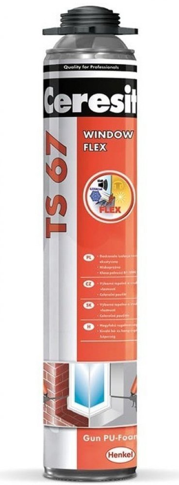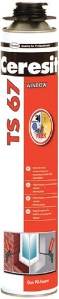 Ceresit TS 67 WINDOW / FLEX je jednosložková pistolová polyuretanová pěna navržená pro profesionální montáž okenních a dveřních rámů, lepení parapetů a prahů, vytváření zvukotěsných clon a utěsňování otvorů ve střešních konstrukcích a izolačních materiálech. Díky svým vynikajícím izolačním vlastnostem a roztažnosti je ideální pro širokou škálu aplikací v oblasti stavebnictví.