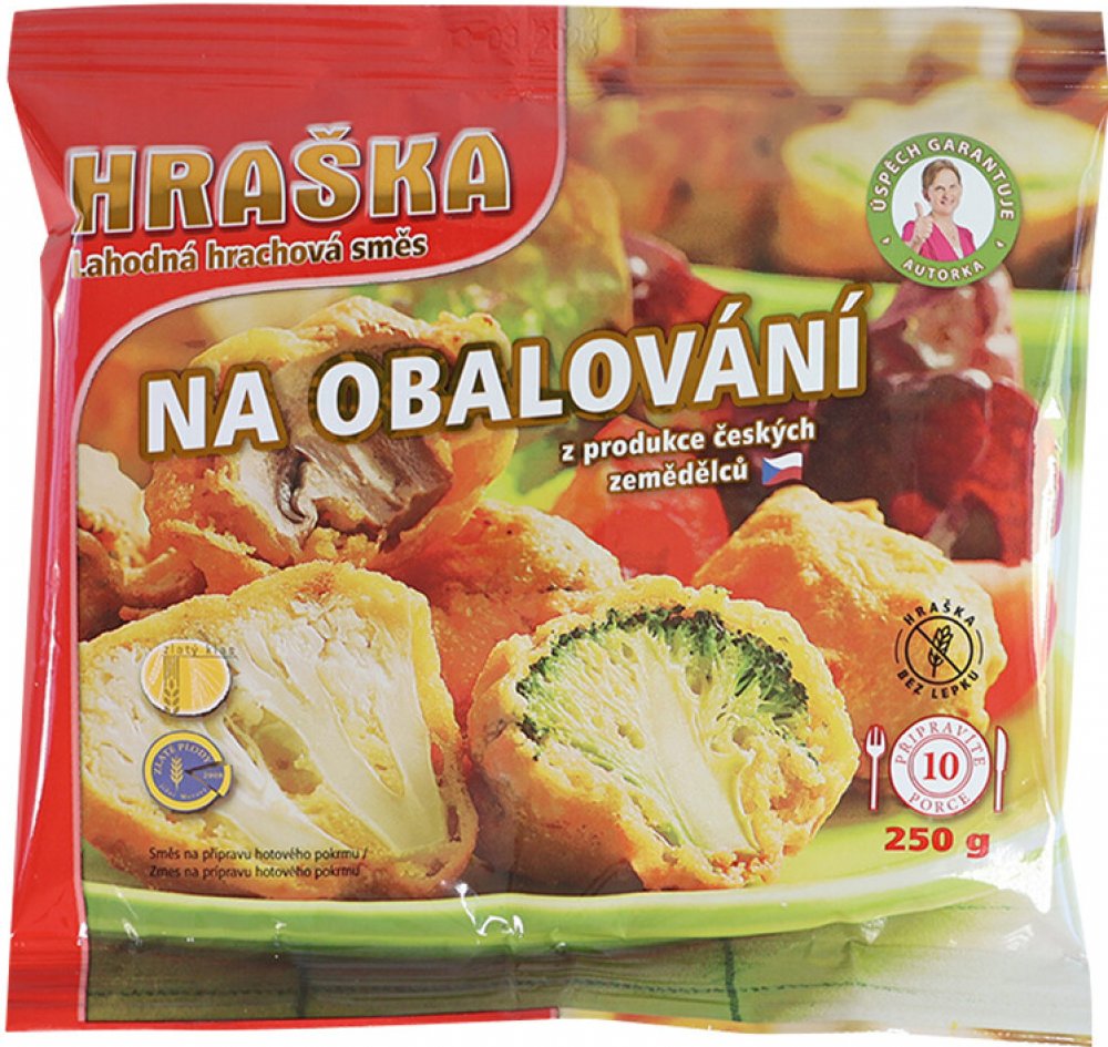 Návod k přípravě: Odměřte jednu polévkovou lžíci Hrašky na porci (20 – 30 g) a pak přidejte vodu a míchejte až do hustoty majonézy či hořčice. V tomto těstíčku obalujte namáčením a smažte v rozpáleném oleji. Těstíčko můžete zavařit do polévek místo jíšky.