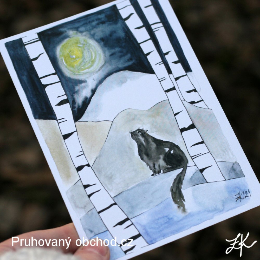 Černá kočka v březovém háji - pohlednice