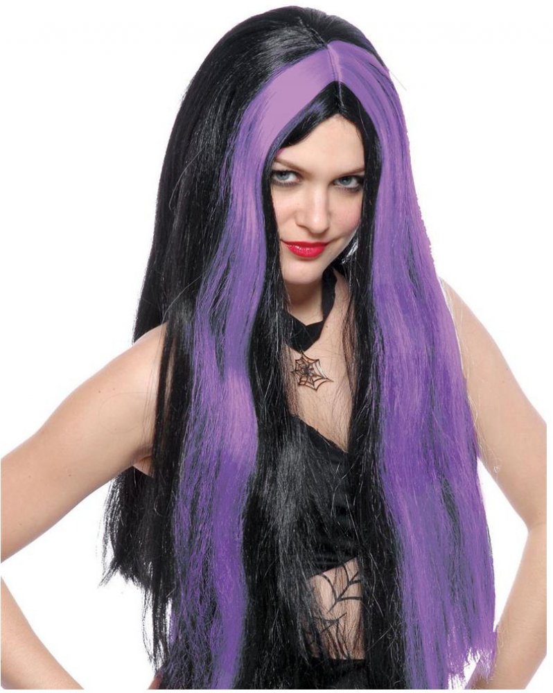 Černá paruka s fialovými pramínky, ideální ke kostýmu čarodějnice. Technické parametry Barva Černá Cílová skupina Holky Téma Karneval Velikost balení 30 x 39 x 15 cm Hmotnost balení 0.2 kg