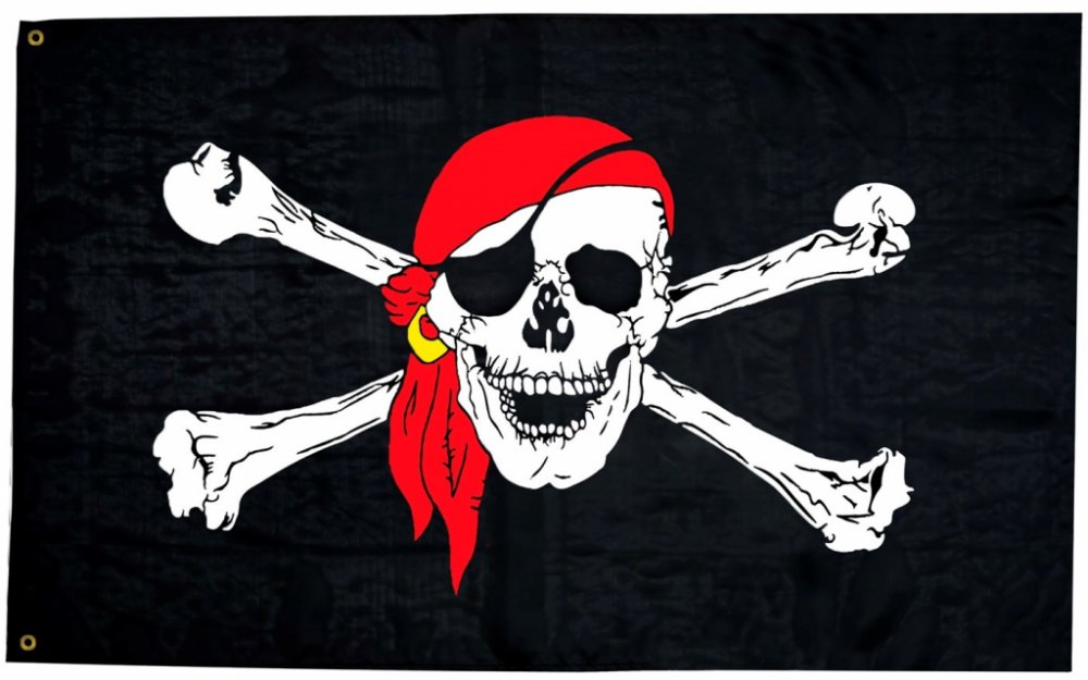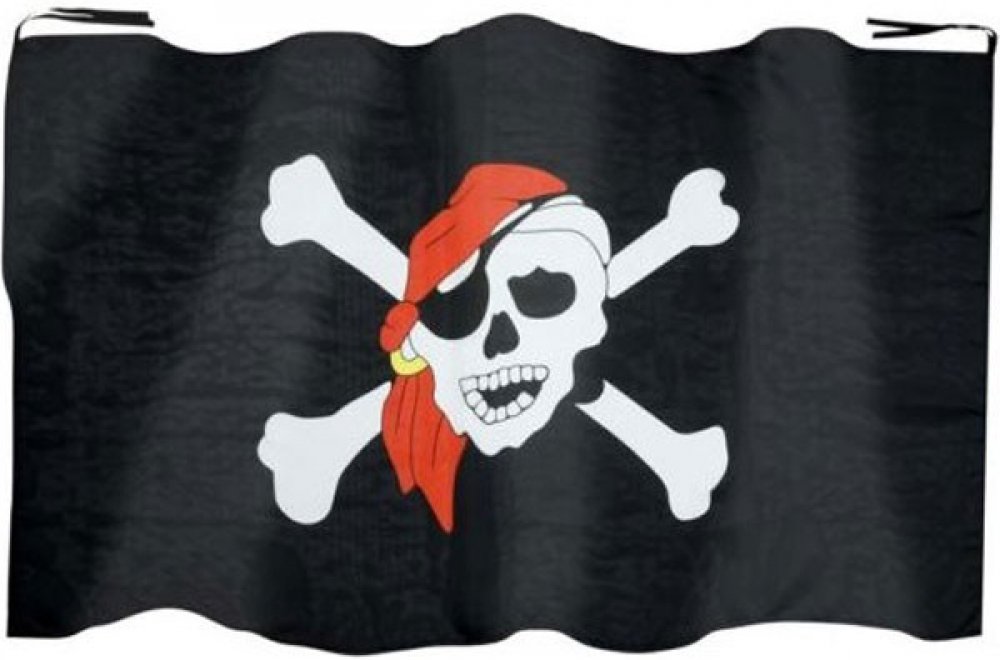 Pirátská vlajka s lebkou a zkříženými hnáty na pirátskou loď nebo tábor. Černá pirátská vlajka o rozměrech 130 x 80 cm.