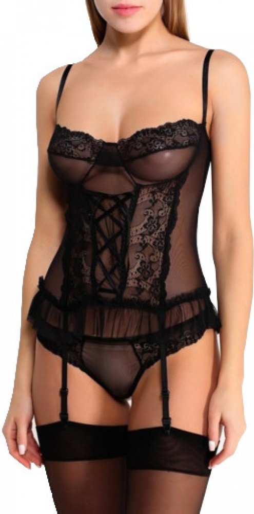 Tanga, která jsou součástí balení, jsou ušita ve stejném duchu jako korzet. Kombinace průsvitné látky s krajkou vás nadchne.