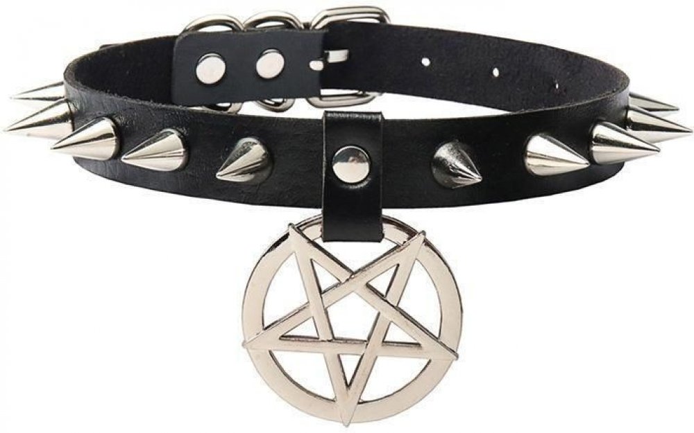 Černý kožený obojek Pentagram s kovovými ostny Fetiš BDSM