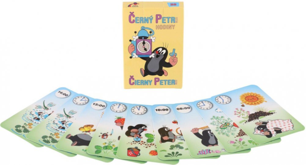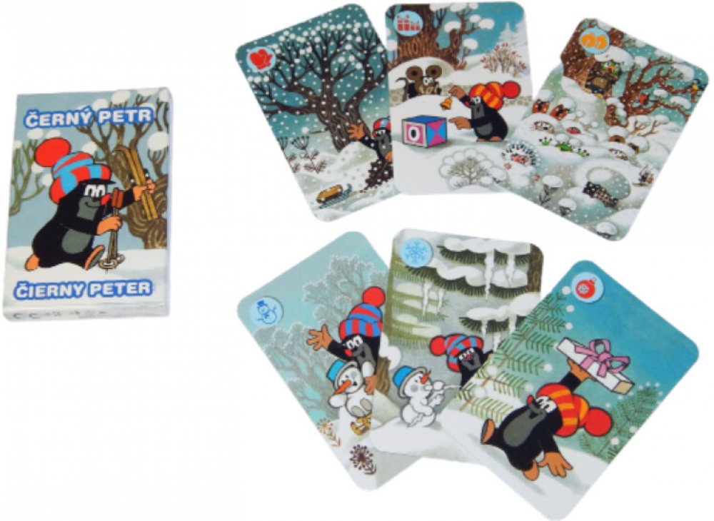 Dětské karty pro hru zvanou "Černý Petr" s obrázky Krtečka - od ilustrátora Zdeňka Milera. Krabička obsahuje i podrobný návod a karty mají na rubové straně mírně zdrsnělý povrch pro lepší manipulaci s nimi.