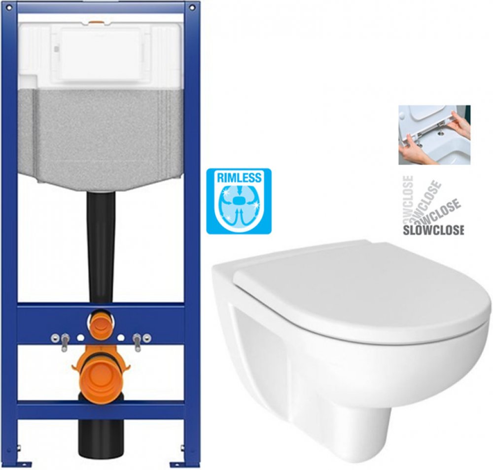 WC kombi RIMLESS /bez splachovacího kruhu/ = je moderní systém splachování, který se charakterizuje znamenitou funkčností a vysokou hygienou oproti běžným klozetům se splachovacím kruhem. U běžných klozetů může docházet k zachycování nečistot ve splachovacím kruhu pod okrajem mísy. Současný systém zajišťuje dokonalý rozvod vody a jednoduché čištění - veškerý prostor uvnitř mísy je smaltovaný a jednoduše čistitelný.