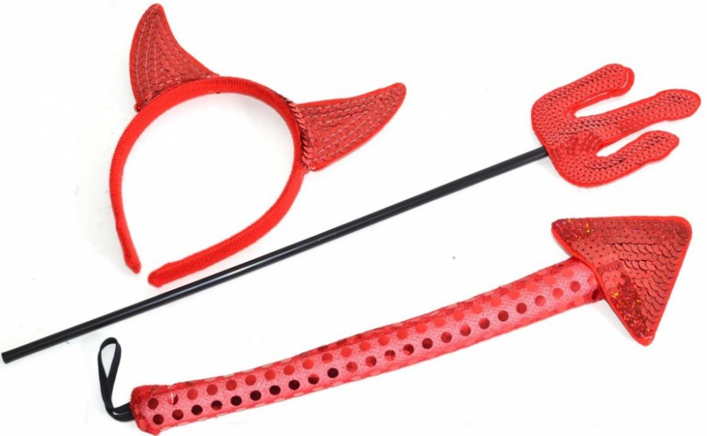 Klíčová slova: čertice, čertí set, kostým, čelenka s růžky, červené flitry, čertovský ocas, trojzubec, doplňky na karneval, kostým čertice, glitrové růžky, Mikuláš, tematické párty