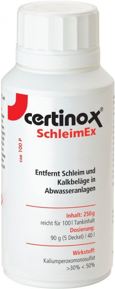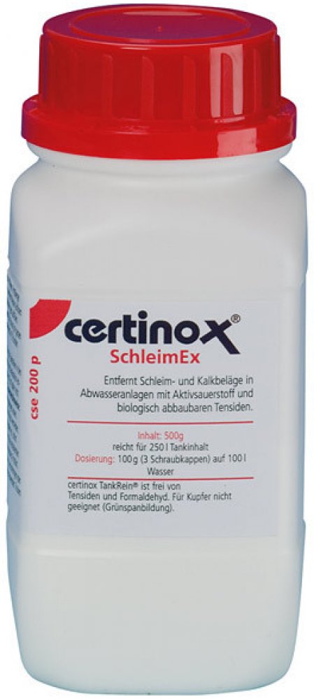 certinox ® - SchleimEX: zbytky potravin, tuky a vlasy tvoří ve vaší nádrži na odpadní vodu často páchnoucí film. SchleimEx odstraní tento film aktivním kyslíkem a odmašťovačem a dezinfikuje nádrž takto.