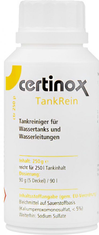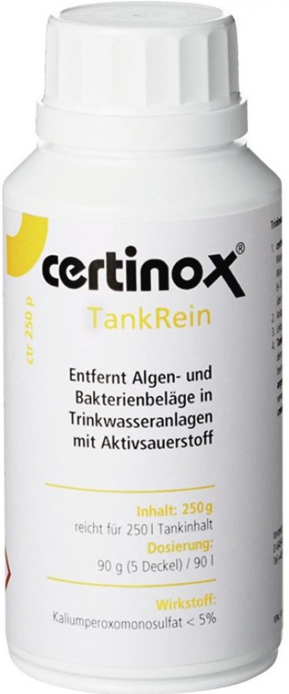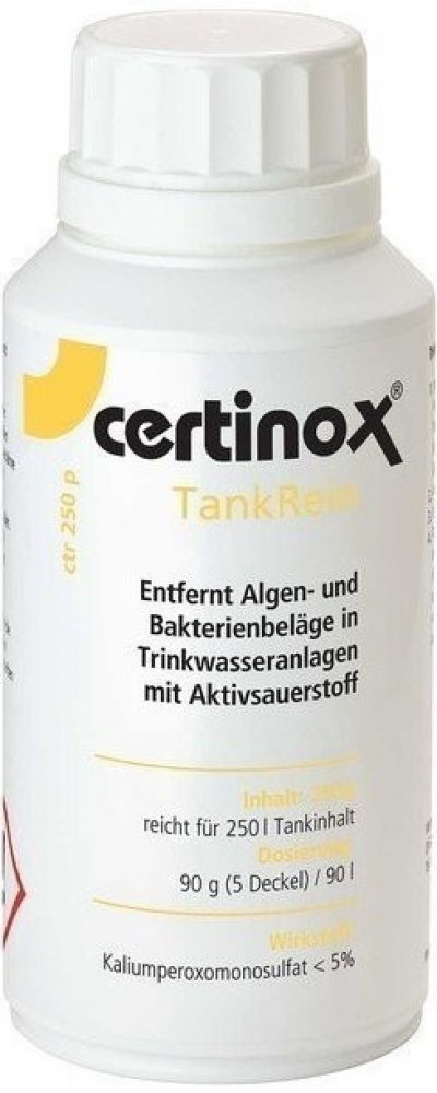 Nejlepší přípravek proti řasám a bakteriím a pro důkladné čištění a taktéž účinná dezinfekce vodovodního systému a vestavných nádrží. Certinox® TankRein rozpouští řasy a bakteriální usazeniny umístěné na vnitřních stěnách nádrží, potrubí a čerpadel aktivním kyslíkem - bez chloru nebo povrchově aktivních látek. Ionty stříbra chrání celý systém pitné vody před opětovnou kontaminací.