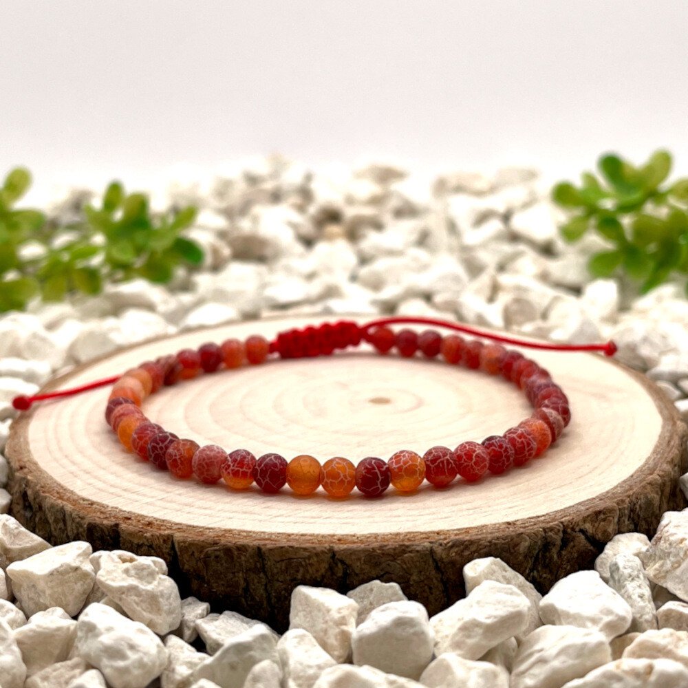 Tento provázkový náramek je tvořen korálky matného červeného achátu o velikosti 4 mm, které se vyznačují jednotným barevným tónem a hladkým povrchem. Minerál je dlouhodobě využíván ve šperkařství pro svůj výrazný vzhled a přírodní původ. Červená nylonová šňůrka barevně navazuje na kámen a vytváří harmonický celek.