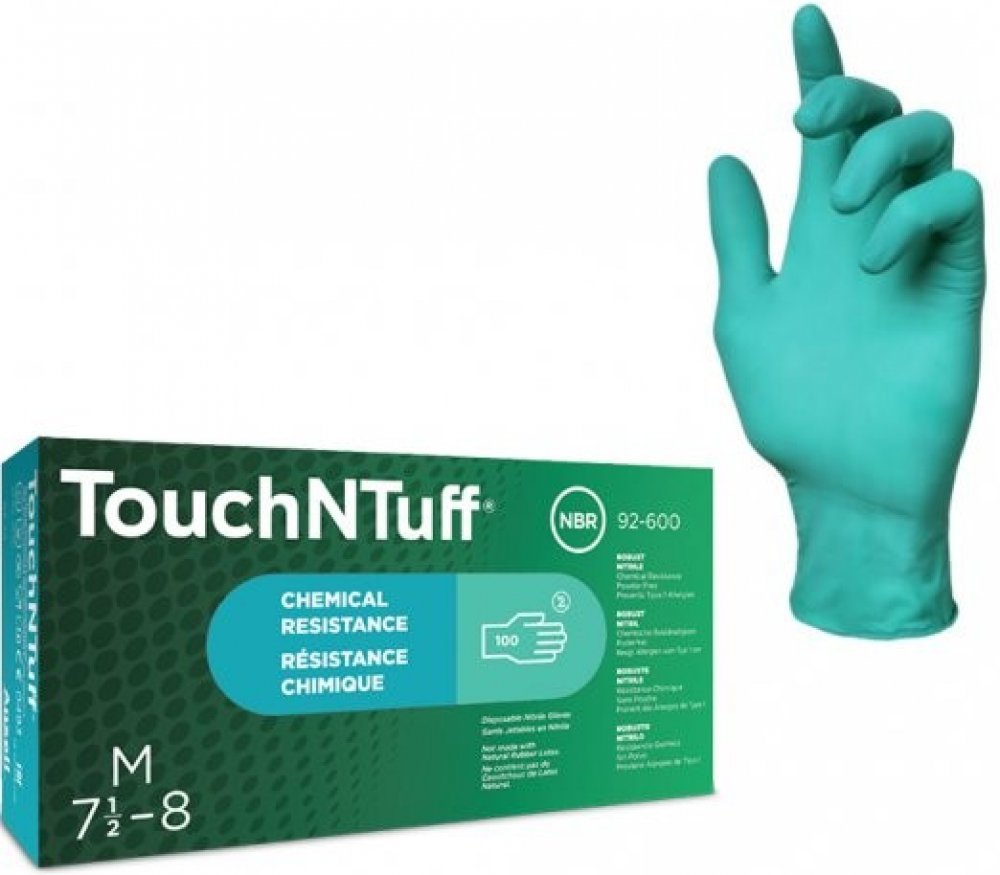 Zelené antistatické nepudrované jednorázové rukavice ze 100% 0,12 mm silného nitrilu bez příměsí, s rolovaným okrajem, délka 24cm. Balení: 100 ks / 1000 v kartonu. Použití: Manipulace s chemikáliemi Laboratorní analýzy Farmaceutický průmysl Lakovny a nástřik barev Tiskařský průmysl Elektronika Úkony lehké montáže Lehká montáž zaolejovaných dílů Sklářský průmysl Manipulace s cytostatiky Manipulace s náročnými díly Další testování rukavic TouchNTuff® certifikovanou zkušebnou na ještě širší škálu chemikálií potvrdilo, že jsou odolné proti širší škále průmyslových chemikálií po delší dobu než jakékoliv jiné nitrilové rukavice pro opakované použití. TouchNTuff® jsou vyrobeny z nitrilu a poskytují až čtyřnásobně vyšší odolnost proti propíchnutí než srovnatelné rukavice z přírodního latexu a trojnásobně vyšší odolnost než podobné neoprenové rukavice. Neobsahují žádné proteiny přírodního kaučuku, což znamená žádné riziko alergií Typu I pro uživatele. Primární studie podráždění pokožky a náplasťové kožní testy rovněž prokázaly, že není žádný důkaz rizika podráždění pokožky nebo alergické kontaktní dermatitidy. Díky unikátnímu složení „Thin Nitril Technology" tyto rukavice nabízejí jednoduché navlékání a silný úchop v mokrých i suchých podmínkách.