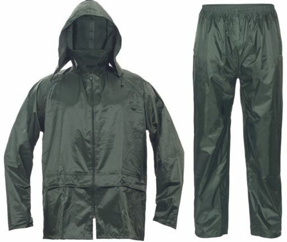 • dvoudílný voděodolný oblek s kapucí • ¾ plášť s integrovanou kapucí v límci a kalhoty v pase do gumy • dvě přední široké kapsy kryté légami proti průniku vody • spodní část rukávů lze regulovat drukem • ventilace na zádech a v podpaží • transportní obal