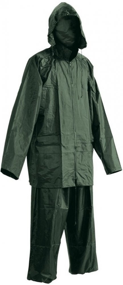 Dvoudílný voděodolný oblek s kapucí. 3 plášť s integrovanou kapucí v límci a kalhoty v pase do gumy. Dvě přední široké kapsy kryté légami proti průniku vody, spodní část rukávů lze regulovat drukem, ventilace na zádech a v podpaží, transportní obal.