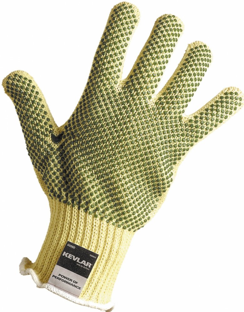 Rukavice CHIFFCHAFF kevlarové PVC terčíky jsou pletené a obouruké. Vyrobeny ze středně silného kevlarového úpletu. Vybaveny pružnou manžetou. Rukavice mají PVC terčíky v dlani, na hřbetu a prstech. Úroveň odolnosti proti prořezu - 3. Materiál: Kevlarový úplet. Nános - dlaň, hřbet, prsty: PVC terčíky. Využití rukavic: Vhodná proti pořezu v rizikových oblastech. Povolání: Strojní průmysl, lehký průmysl, inženýrství, sklad, služby a logistika. Velikost: 7 (S) - 10 (XL) Barva: žlutá-zelená Norma: EN 420, EN 388-1341 Pletené bezešvé obouruké rukavice ze středně silného kevlarového úpletu