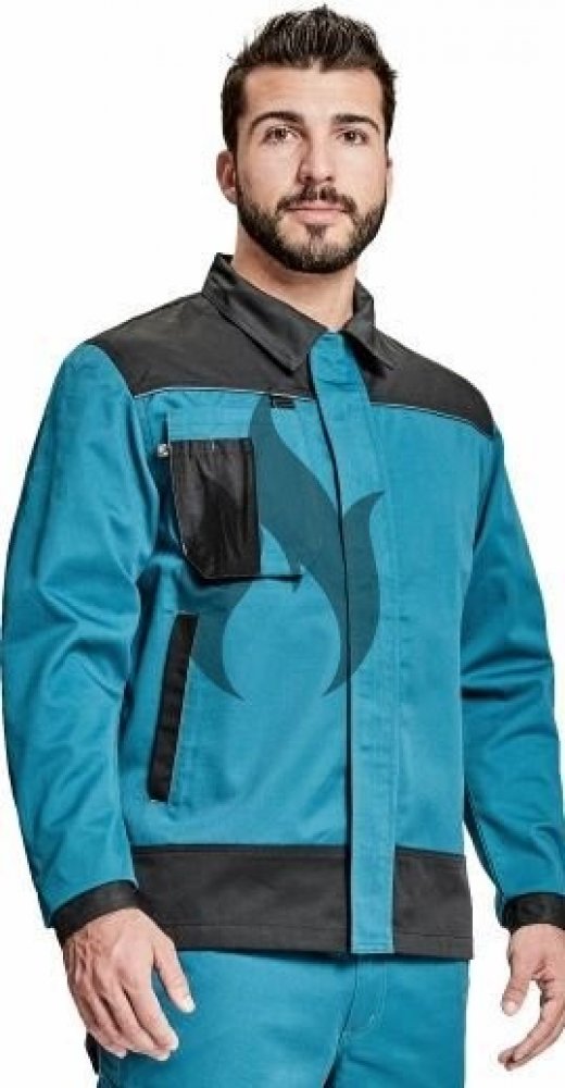 Pánská pracovní bunda byla vyrobena z materiálu obsahujícího vysoké proocento bavlny (60 % bavlna, 40 % polyester, twill, 230 g/m2).