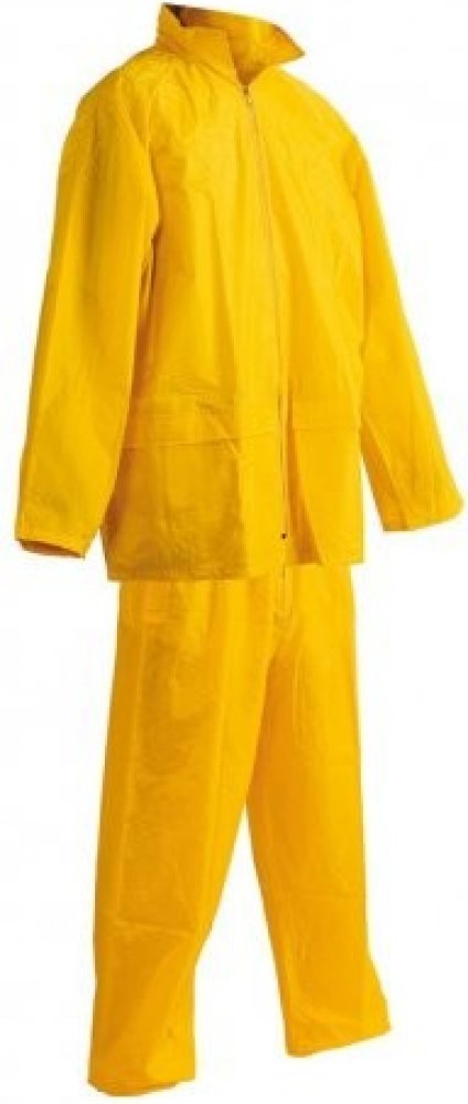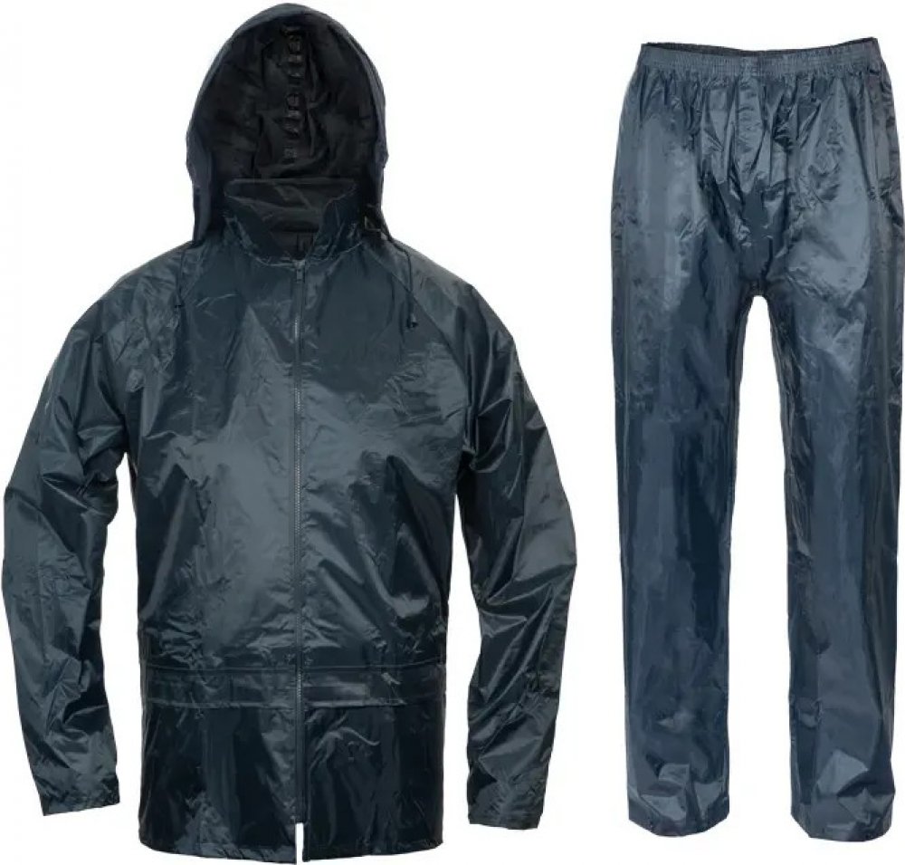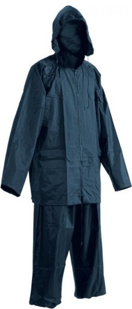 Dvoudílný voděodolný oblek s kapucí; ¾ plášť s integrovanou kapucí v límci a kalhoty v pase do gumy; dvě přední široké kapsy kryté légami proti průniku vody; spodní část rukávů lze regulovat drukem; ventilace na zádech a v podpaží; transportní obal.