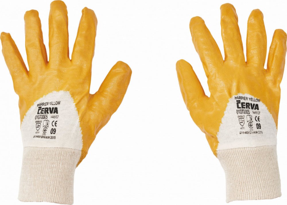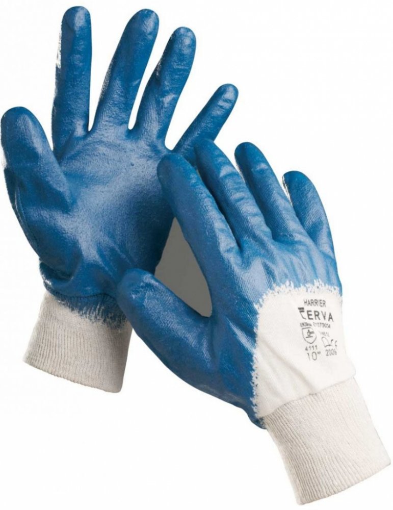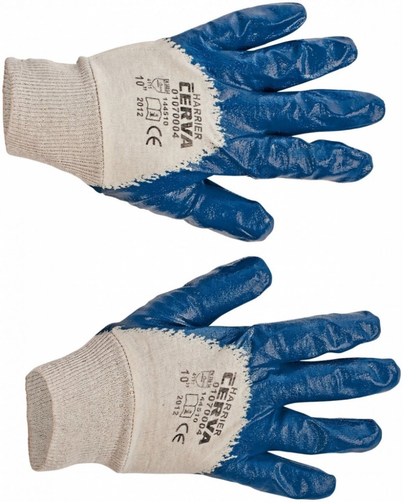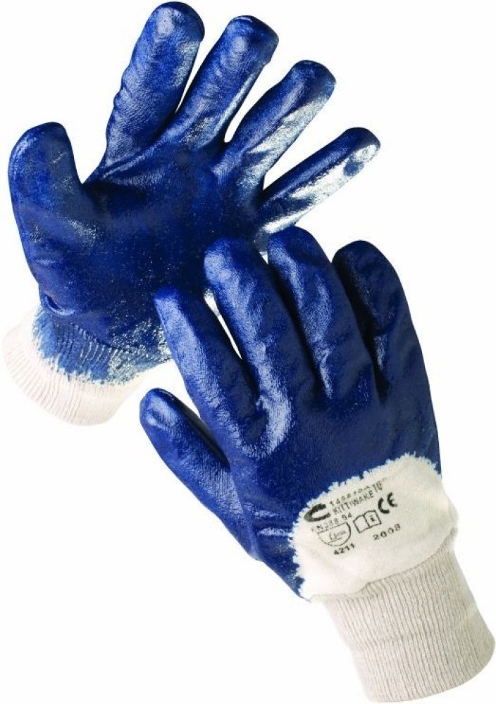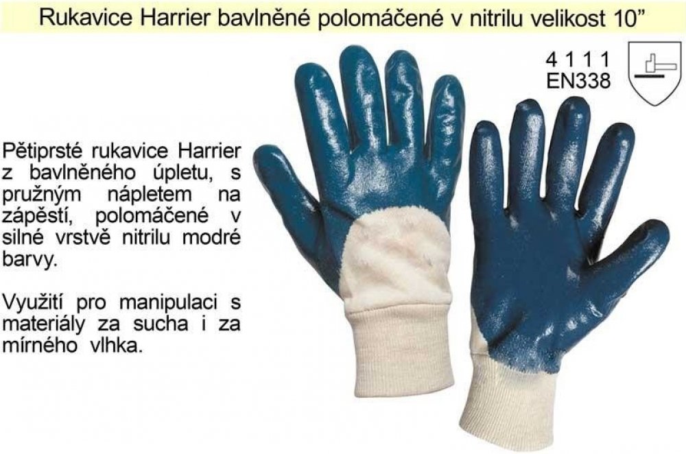 Rukavice šité z bavlněného úpletu, polomáčené v nitrilu, s pružným nápletem. Splňuje normy: EN 420, EN 388 proti mechanickým rizikům. Typy barevevného provedení: modrý, žlutý. Vel.: 7, 8, 9, 10. V barvě modré také ve velikosti 11. Rukavice jsou baleny po 12 párech.