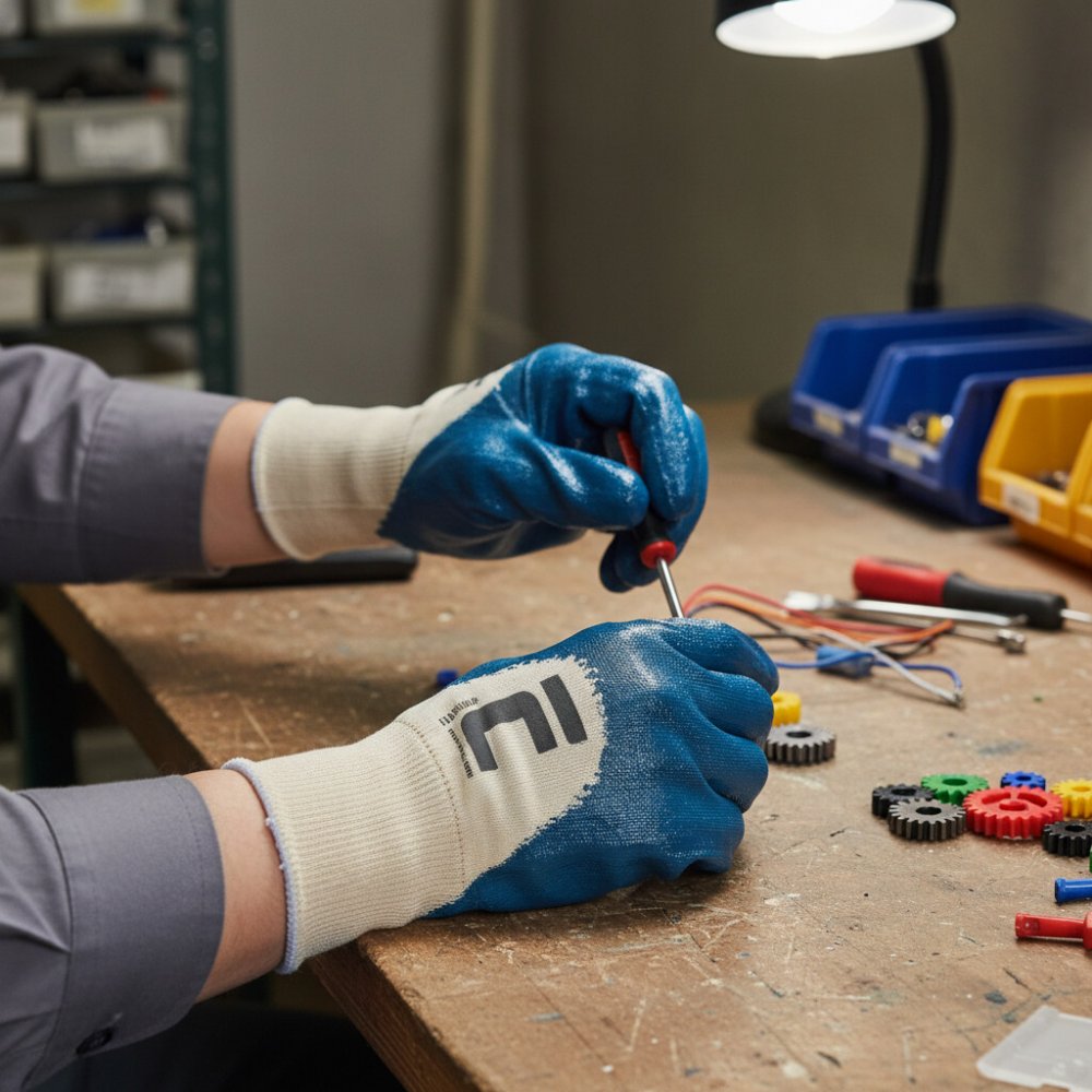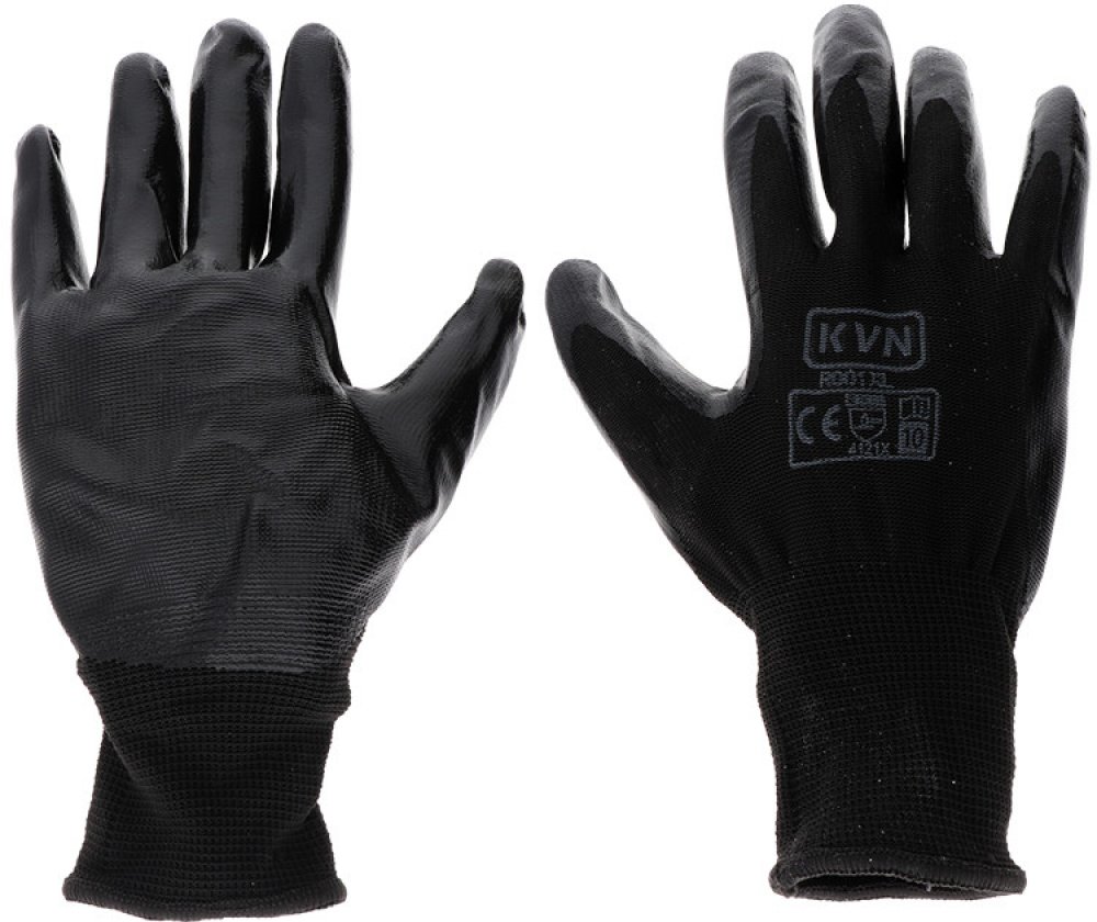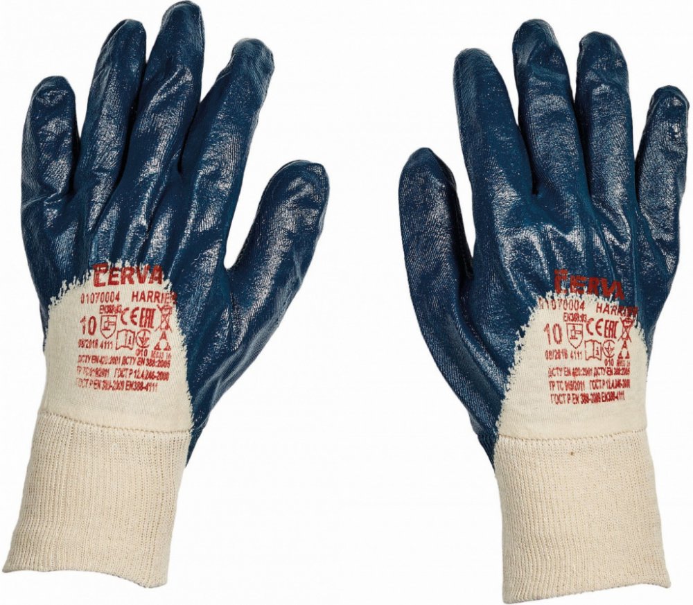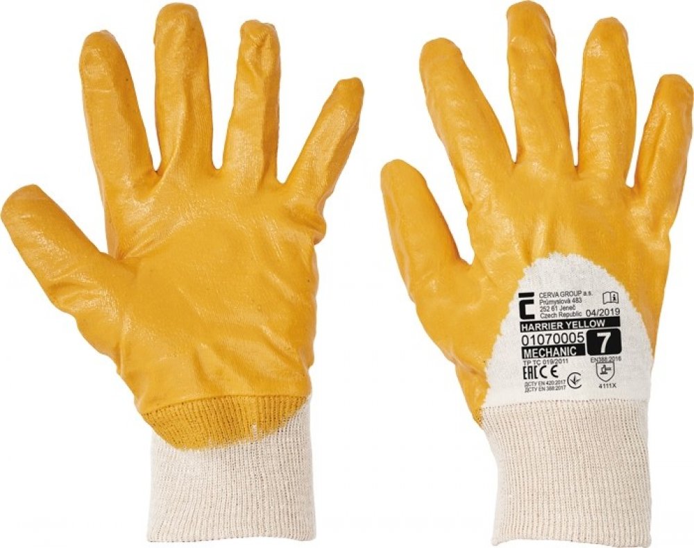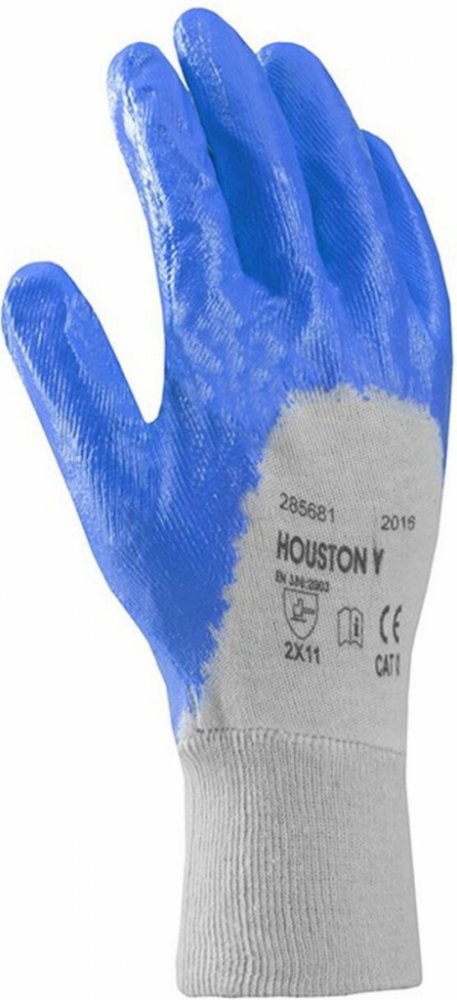 Rukavice šité z bavlněného úpletu, polomáčené v nitrilu, s pružným nápletem. Splňuje normy: EN 420, EN 388 proti mechanickým rizikům. Typy barevevného provedení: modrý, žlutý. Vel.: 7, 8, 9, 10. V barvě modré také ve velikosti 11. Rukavice jsou baleny po 12 párech.