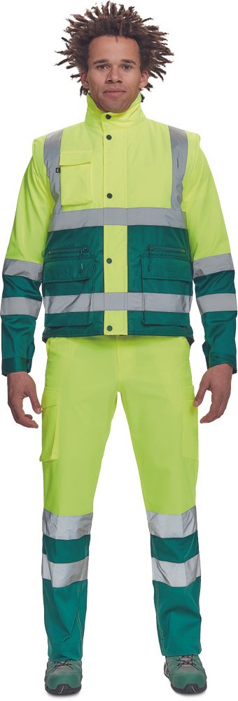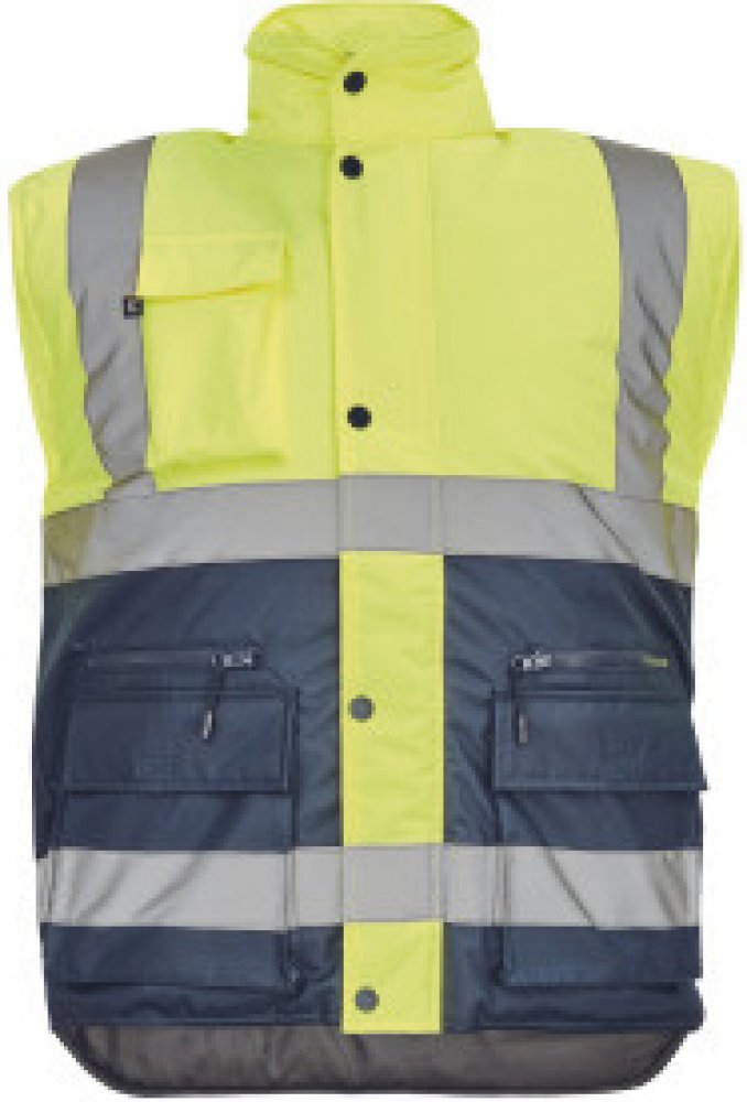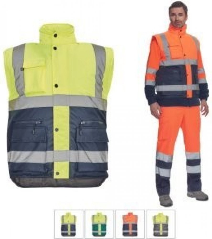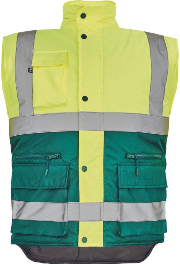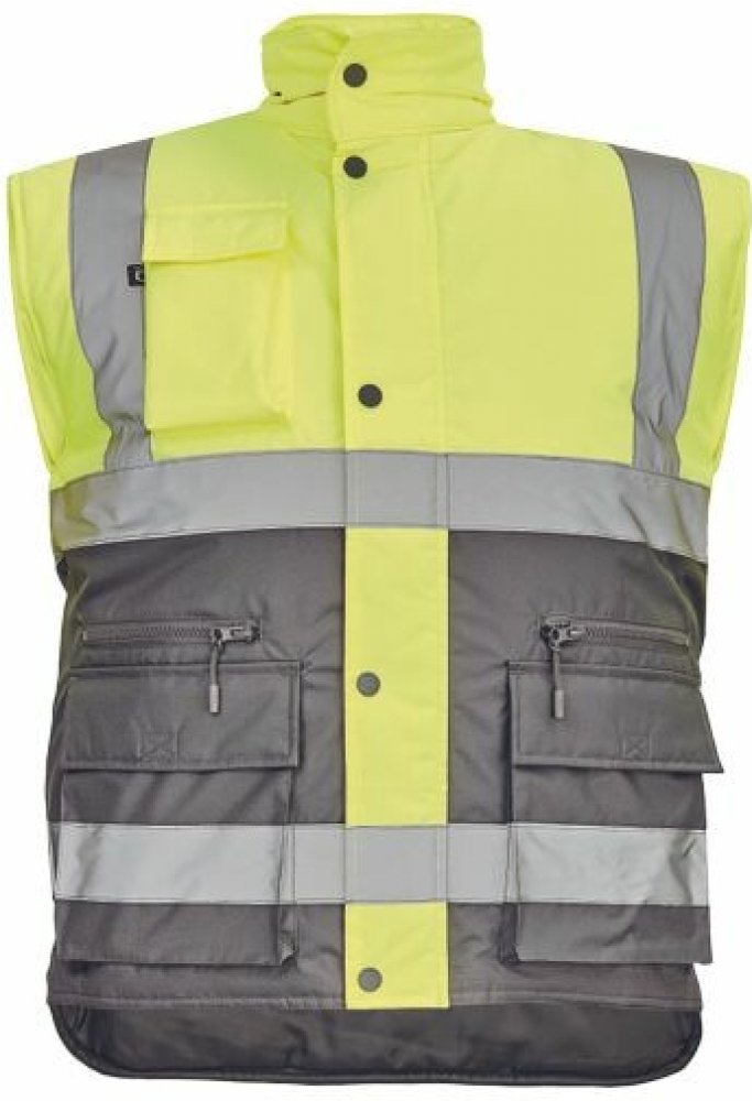 Pánská zateplená hi-vis vesta s reflexními pruhy přes ramena a v bocích. Kapuce skrytá v límci. Zapínání na zip kryté légou se zapínáním na druky. 2 přední multifunkční kapsy s klopou a zapínáním na zip. 1 náprsní kapsa s klopou.