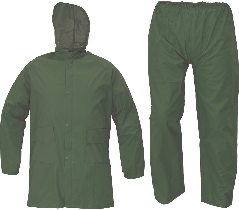 • voděodolný dvoudílný oblek • ¾ plášť s kapucí a kalhoty v pase na gumu • všechny spojovací švy jsou zatavené • materiál s nánosem PVC • dvě přední kapsy kryté légami proti průniku vody • spodní část rukávů lze regulovat drukem • ventilace na zádech a v podpaží