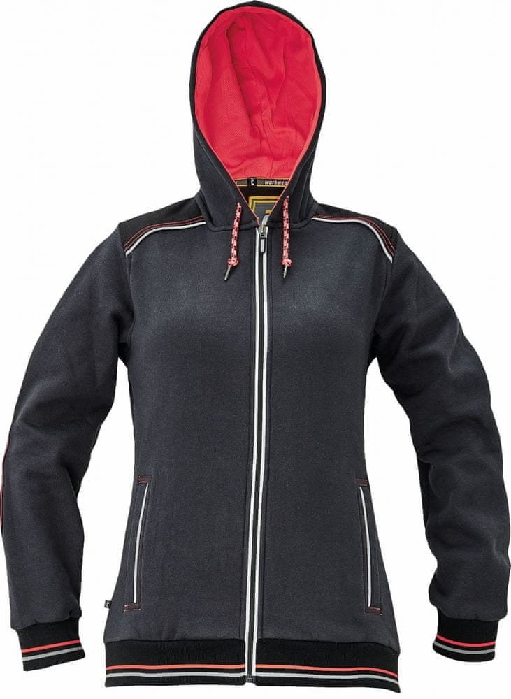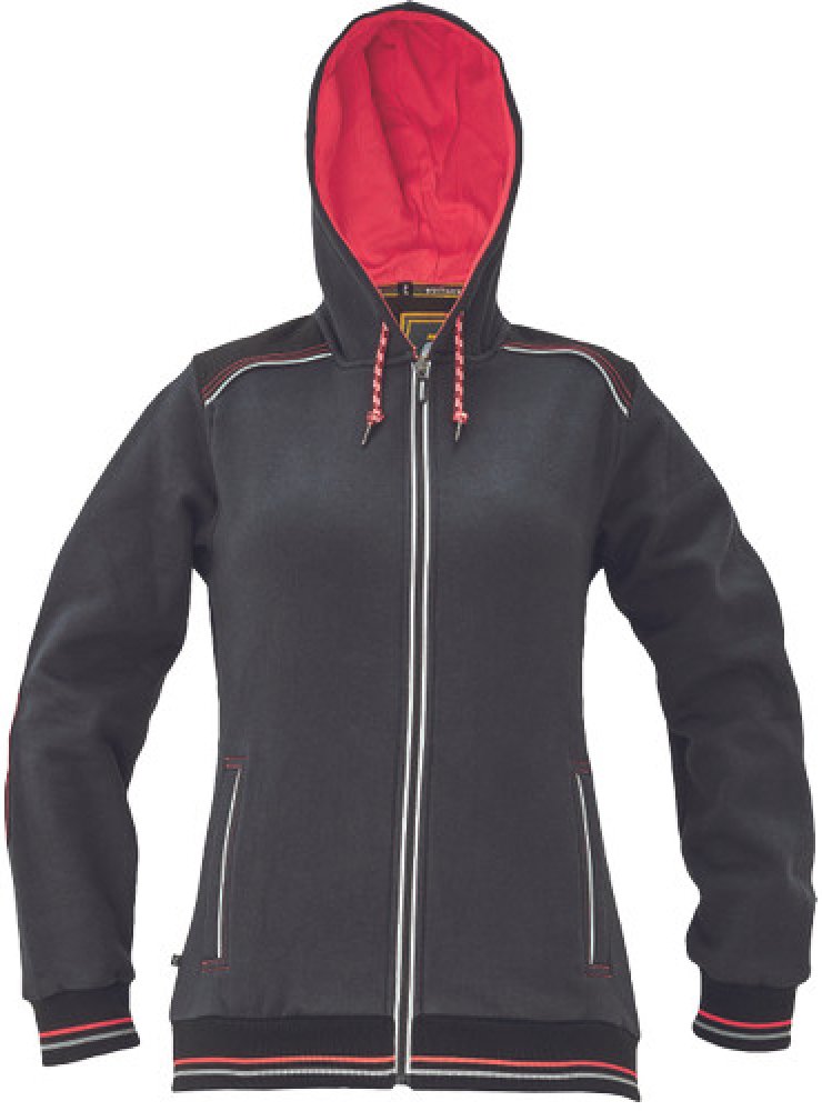 Dámská celopropínací mikina s kapucí z počesaného úpletu bavlny a polyesteru. Pro větší výdrž při namáhavé práci je mikina zesílená v oblasti ramen a loktů. Sedlo a kapsy jsou lemované reflexní pastulkou. Kapuce je dvojitá s kontrastním hi-vis úpletem v barvě zipu a dekorativním prošitím. Rukávy a spodní obvod je z pružného úpletu.