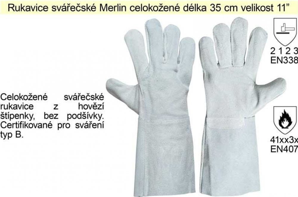 Celokožené rukavice z hovězí štípenky, s 15 cm širokou manžetou, bez podšívky. Certifikát: svářečské práce - typ B. Splňuje normy:EN 12477 Ochranné rukavice pro svářeče TYP B, EN 420, EN 407 Ochranné rukavice proti tepelným rizikům, EN 388 Ochranné rukavice proti mechanickým rizikům. Vel.:11. Rukavice jsou baleny po 12 párech. Prodej pouze po celém balení (prodej pouze po 12 párech).
