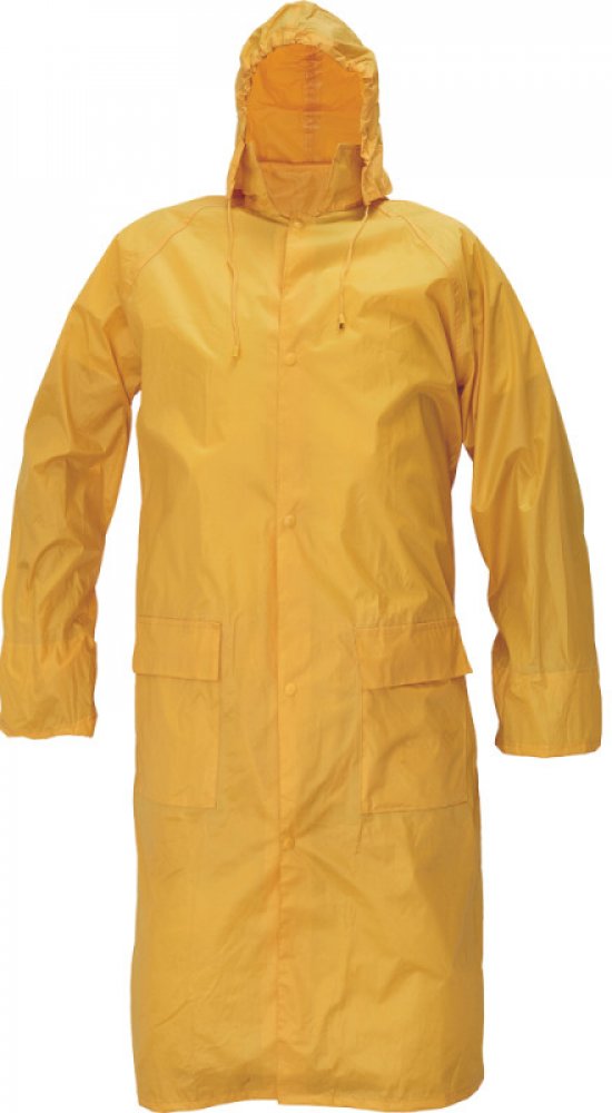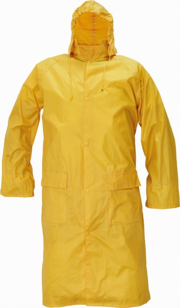 Voděodolný ¾ plášť s integrovanou kapucí. prodloužená délka, plášť má přelepené švy, dvě přední kapsy kryté légami proti průniku vody, vnitřní manžeta do gumy, ventilace na zádech a v podpaží, praktické, dobře skladovatelné balení. Materiál: 100 % PVC. Barevné provedení: modrá, žlutá, zelená. Vel. M-3XL