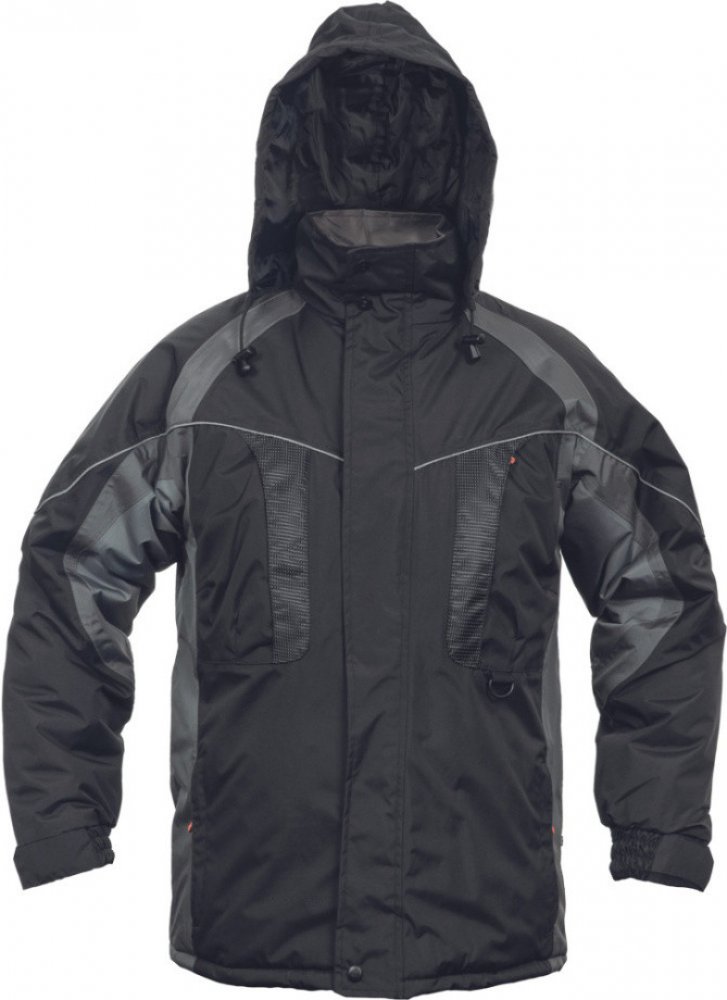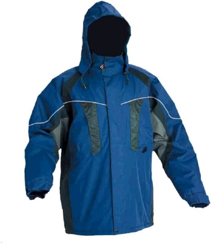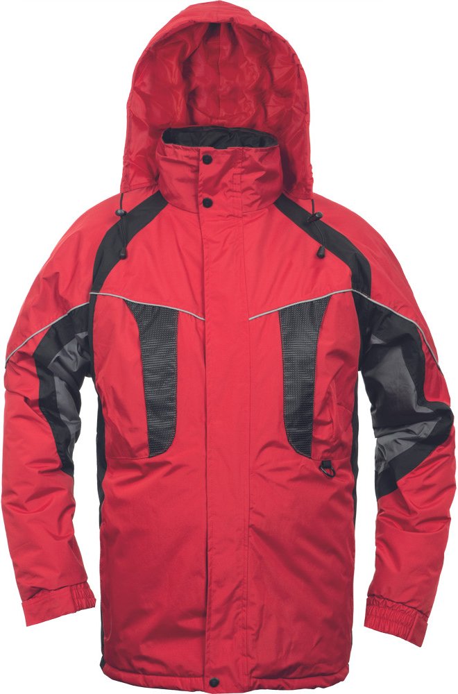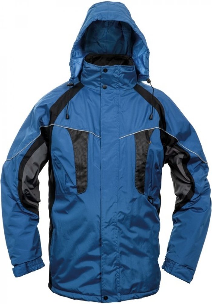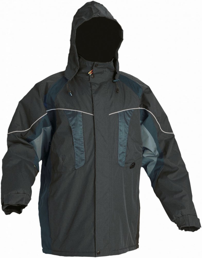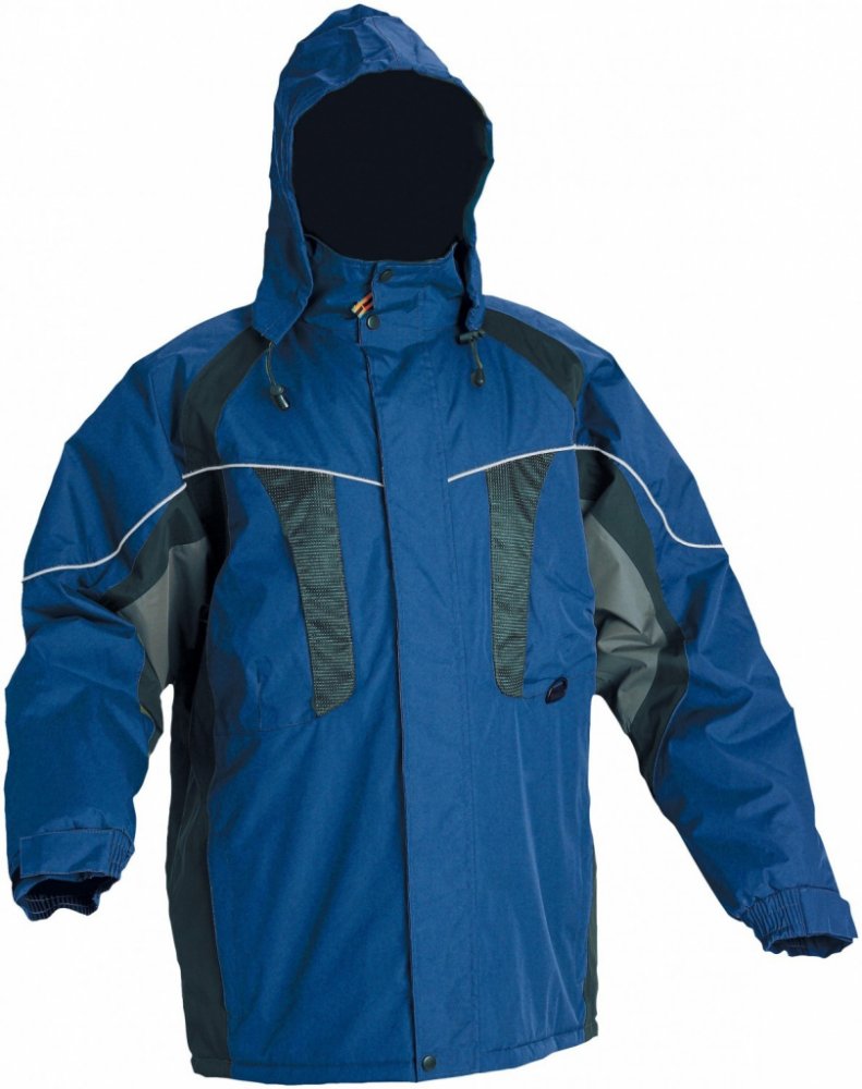 Nepromokavá zateplená bunda s kapucí v límci, svrchní materiál s mechanicky odolnou úpravou, spodní lem ke stažení na šňůrku, reflexní doplňky. Materiál 100% polyester. Barva:šedá, zelená, červená, modrá, černá. Velikosti: S-3XL. Barva modrá i ve velikosti XS a 4 XL.