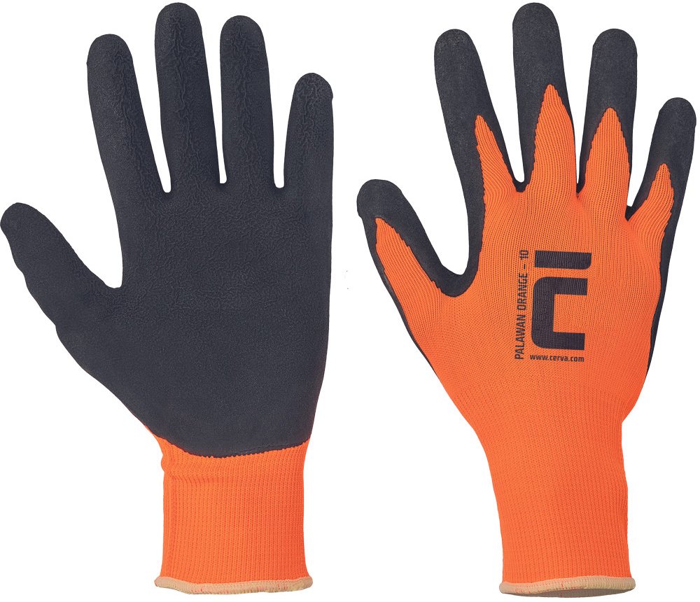 Povrstvené pletené rukavice ČERVA PALAWAN ORANGE jsou vyrobeny z nylonu s vrstvou mikorporézního paropropustného latexu v dlani a na prstech.