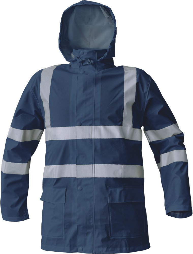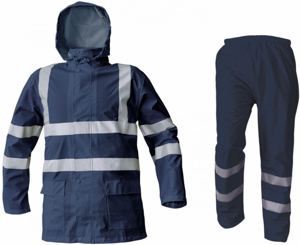 • nepromokavý a větruodolný komplet bundy a kalhot • ¾ plášť s kapucí v límci • kalhoty s gumou v pase • reflexní pruhy bundy po obvodu pasu, boků, rukávů a přes ramena • reflexní pruhy kalhot po obvodu spodních nohavic • dvě přední kapsy bundy kryté légami • spodní lem rukávů lze upravit drukem • HI-VIS provedení pouze ve žluté a oranžové barvě