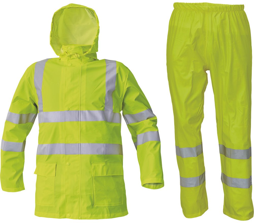• nepromokavý a větruodolný komplet bundy a kalhot • ¾ plášť s kapucí v límci • kalhoty s gumou v pase • reflexní pruhy bundy po obvodu pasu, boků, rukávů a přes ramena • reflexní pruhy kalhot po obvodu spodních nohavic • dvě přední kapsy bundy kryté légami • spodní lem rukávů lze upravit drukem • HI-VIS provedení pouze ve žluté a oranžové barvě