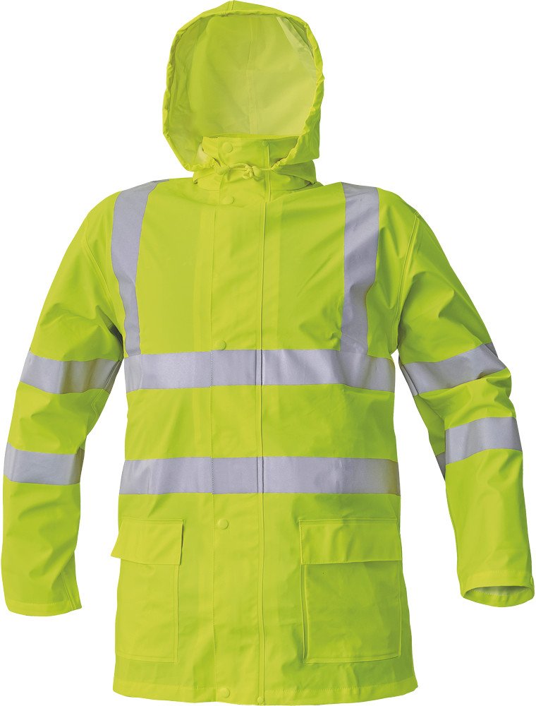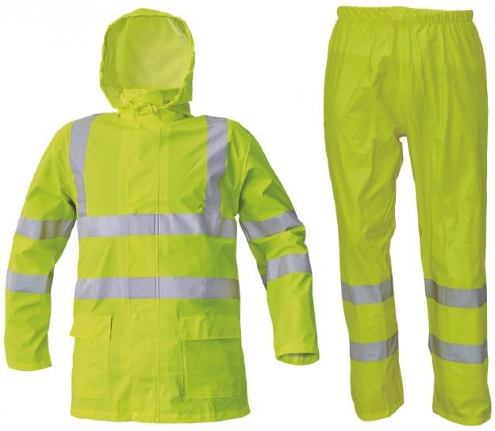 • nepromokavý a větruodolný komplet bundy a kalhot • ¾ plášť s kapucí v límci • kalhoty s gumou v pase • reflexní pruhy bundy po obvodu pasu, boků, rukávů a přes ramena • reflexní pruhy kalhot po obvodu spodních nohavic • dvě přední kapsy bundy kryté légami • spodní lem rukávů lze upravit drukem • HI-VIS provedení pouze ve žluté a oranžové barvě