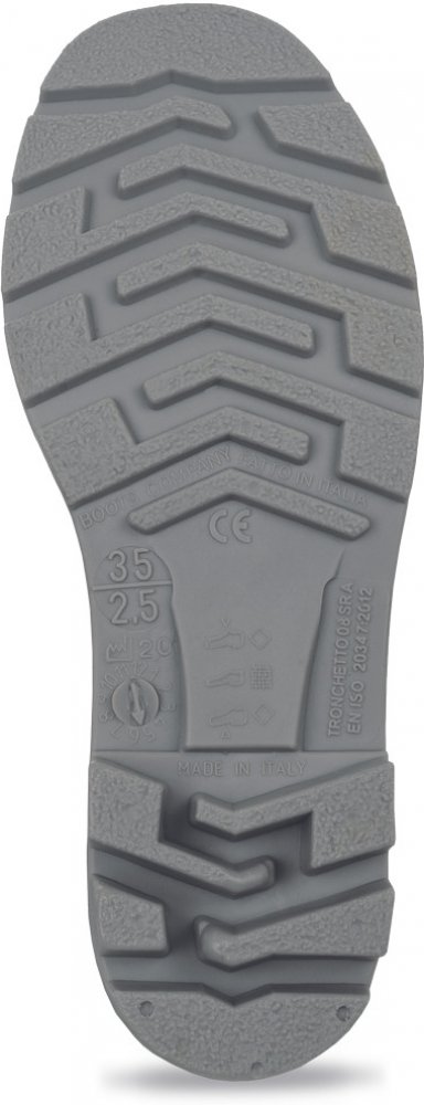 Nízké holínky z PVC a nitrilu odolné proti působení rostlinných a živočišných tuků s podešví s hlubokým dezénem. Výška: 28 cm.
