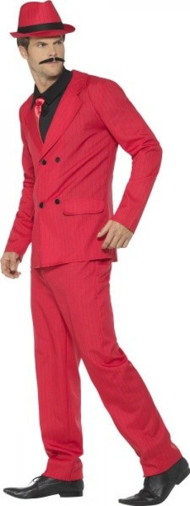 30. léta minulého století se vyznačovala nejen charlestonem, ale také prohibicí, mafií a jazzem. K tomu také patřila specifická móda. Červený kostým mafiána využijete na karnevalovou párty ve stylu 30. let, mafiánských plesech a jazzových koncertech. Celý pánský oblek zdobí tenké černé proužky.