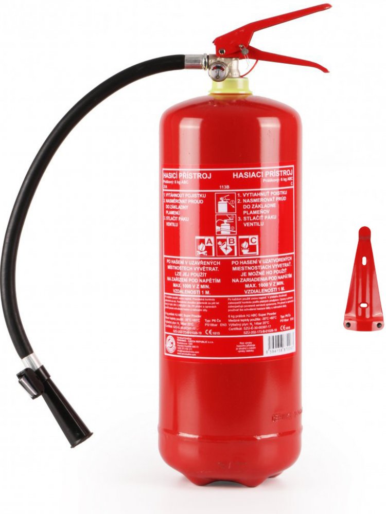 Ruční práškový hasicí přístroj s vyšší účiností, s obsahem 6kg hasiva. Hasební schopnost 34 A/183 B/C. Vhodný pro kolaudaci do nového rodinného domu Hasící přístroje jsou včetně záznamového protokolu (revize) a připravené pro kolaudaci