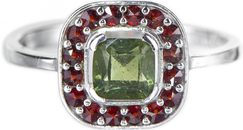 Stříbrný prsten osazený pravými českými granáty a vltavínem. Ke každému šperku přikládáme certifikát pravosti a dárkovou krabičku. Český granát pochází z nalezišť Podsedice a Dolní Olešnice. Český výrobek s nezaměnitelným charakterem. V jednoduchosti je krása. Toto dokonale platí pro elegantní šperky z pravého českého granátu.