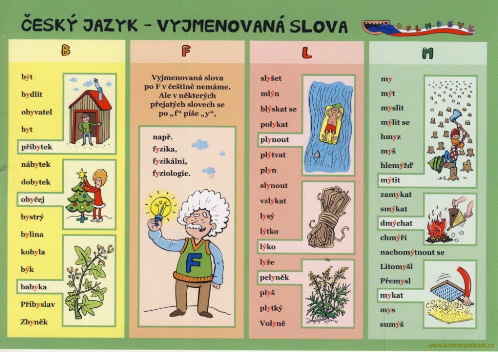 Publikace: Český jazyk – Vyjmenovaná slova - neuveden. Laminátová kartička určená pro žáky 1. stupně ZŠ nabízí stručné a přehledné znázornění těch nejdůležitějších vyjmenovaných slov po B, (F), L, M, P, S, V a Z. Některá méně známá slova jsou doprovázená drobnými ilustracemi. Publikace: Český jazyk – Vyjmenovaná slova - neuveden.